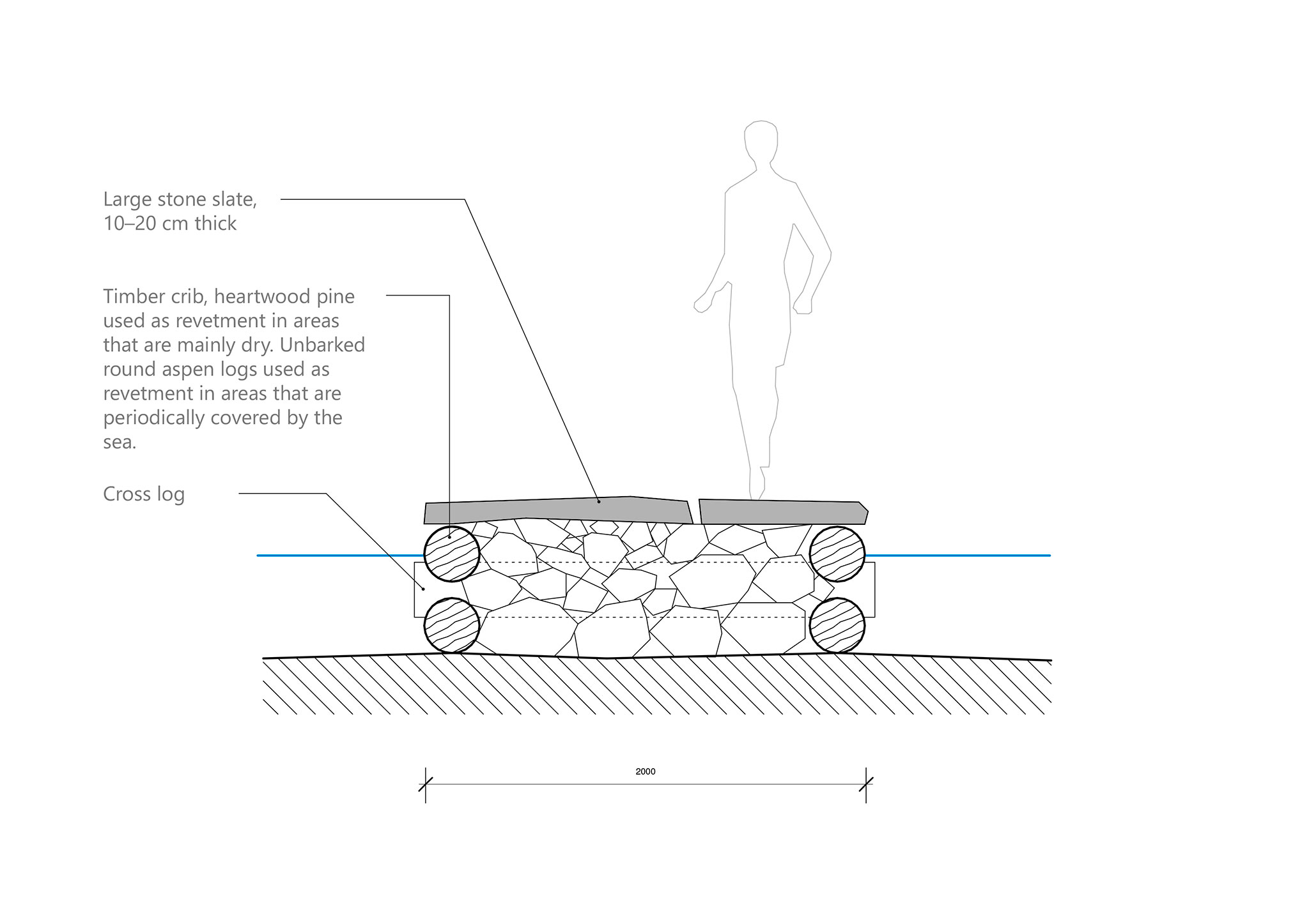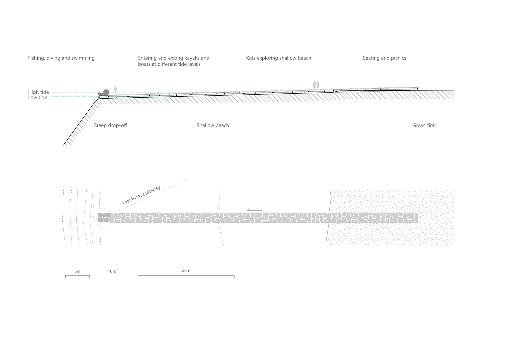 Programáticamente, la intervención realizada por Rever and Drage se compone de una zona de picnic pública, un lugar de baño y un área de descanso para residentes y visitantes. Un embarcadero de piedra y madera define el principal elemento del proyecto. Como un suave sendero que se adentra hacia el horizonte, la plataforma dialoga formalmente con la imagen histórica del paisaje costero de Noruega.