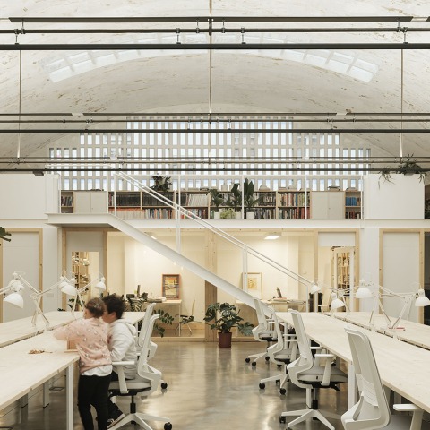 Dividimos la planta rectangular del local en tres partes: la primera y más inmediata a la calle pensada para salas y espacios de reunión de uso interno o externo, la central donde alrededor del núcleo de servicios (aseo, office) se ofrece, a modo de llar, la posibilidad de reunirse en torno a una charla, un café o una exposición y la final, bajo el ámbito abovedado del antiguo taller, planteada como un lugar donde la luz y el tiempo que bañan sus paredes inviten a trabajar, leer, pensar o celebrar en un recinto flexible con mesas para trabajo en abierto, boxes para reuniones o grabaciones y una biblioteca en altillo que puede transformarse por ejemplo en sala de descanso o plataforma para pinchar música.