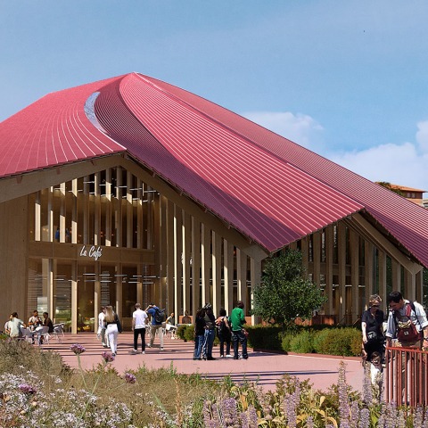 Construido principalmente en madera, el centro con sus 12.000 m² de superficie conecta con la estación central de trenes en el oeste y encaja los flujos de peatones y bicicletas de la ciudad hacia el este, actuando como un vínculo entre el centro de la ciudad, el Canal du Midi, declarado Patrimonio de la Humanidad por la UNESCO, y el barrio Périole.
