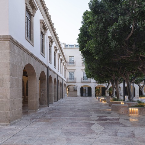Como parte estructural de la intervención, la propuesta desarrollada por Ordaz Estudio de Arquitectura utilizó distintos cortes de piedra de Alhama de Almería, obteniendo como resultado una gran alfombra de pavimento compuesta por una multiplicidad de figuras aleatorias que crearon una interesante composición geométrica.