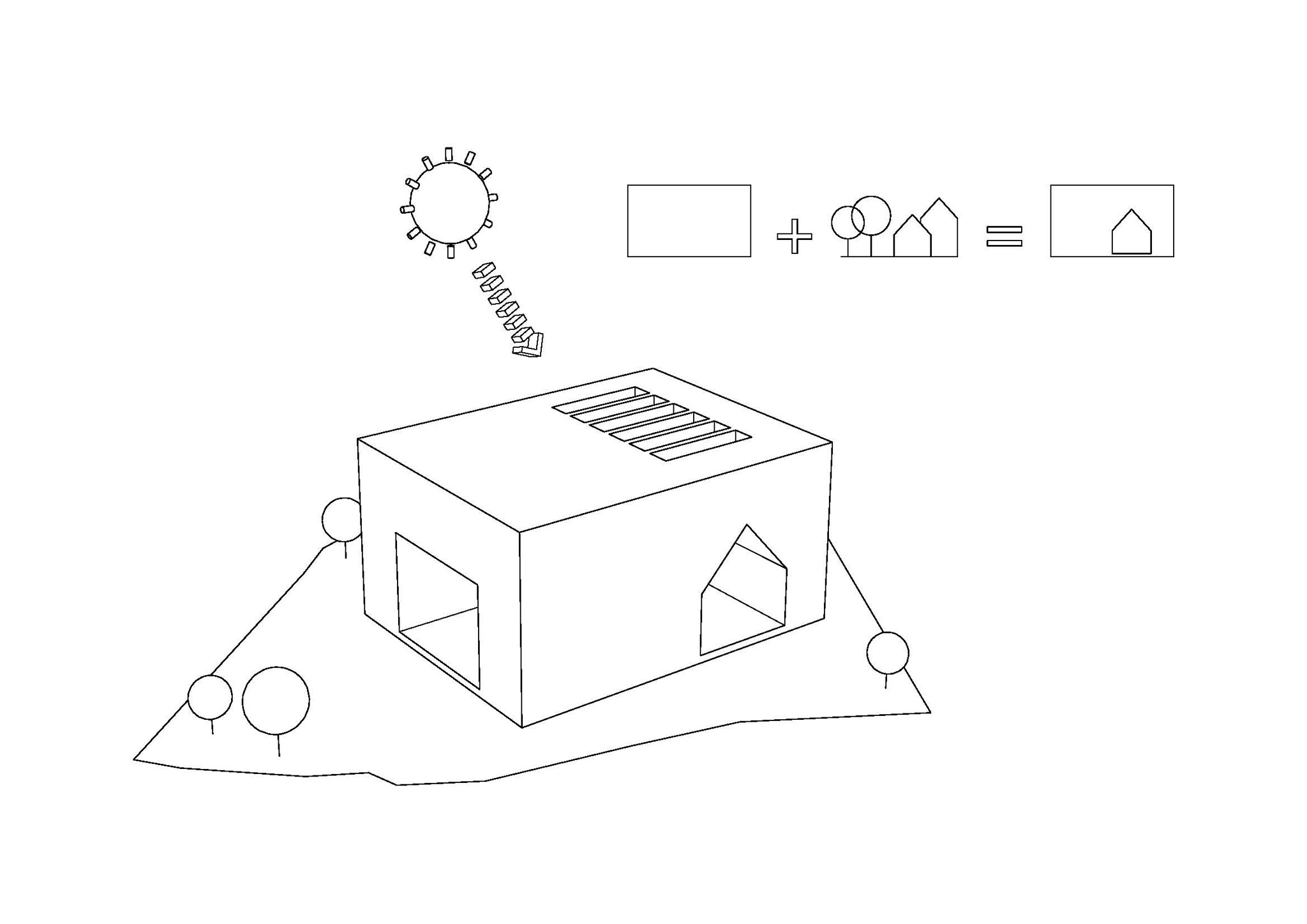 El sitio del proyecto es sencillo y las casas circundantes están en varias formas. Desde un punto de vista diferente, existía la variedad habitual. Pensé que la forma paradójica de revertir la gramática existente sería efectiva para sentir emociones especiales en el escenario ordinario. Específicamente, la forma general está invertida. Es una forma de vaciar la forma del techo a dos aguas en forma de caja cuadrada. En otras palabras, invierte la forma normal y tiene la intención de preguntar qué es lo normal.