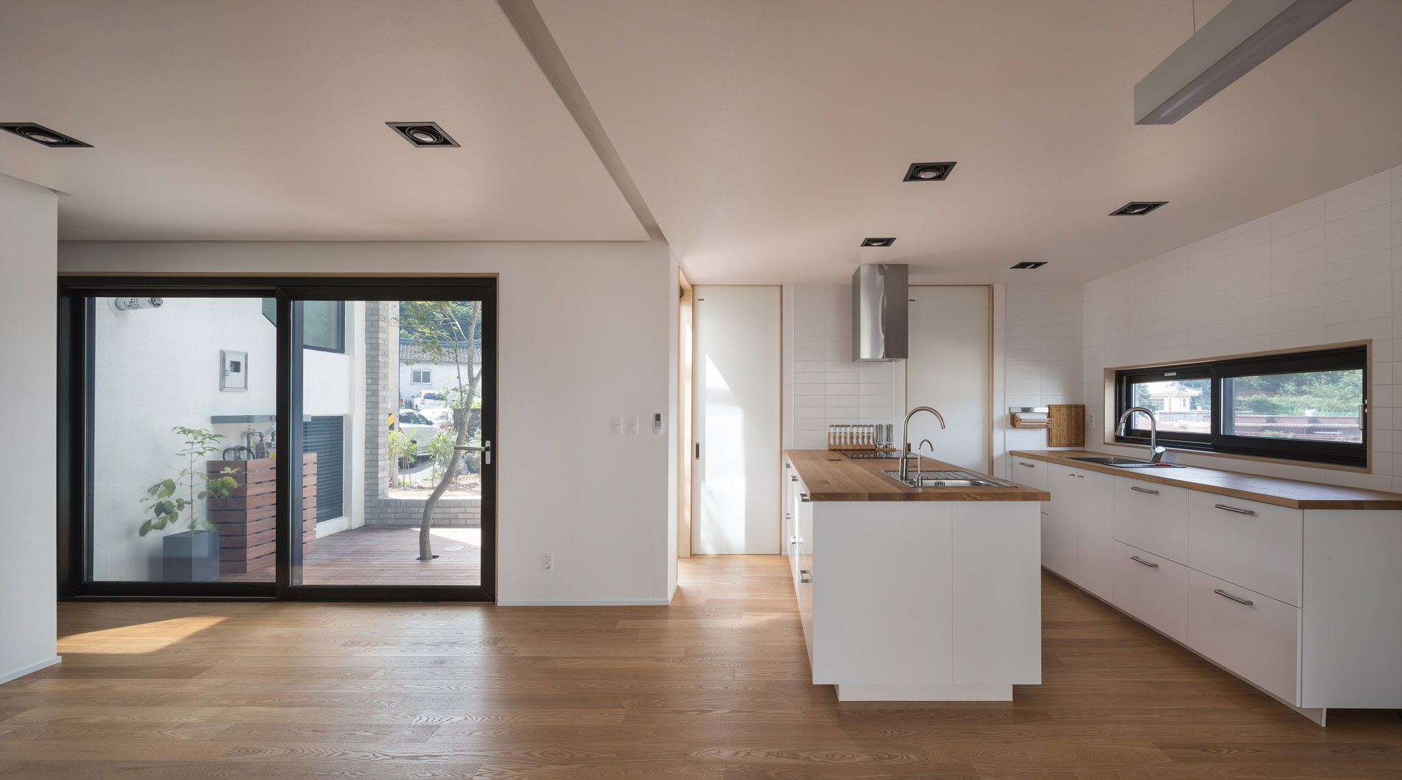 El espacio desocupado en forma de hastial se convierte en una de las secuencias que entran a la casa. Y que brille la luz del sol indirectamente. El espacio desocupado en forma de espacios cambia con el tiempo y la sensación de espacio también cambia. El espacio desocupado de la forma normal cambia con el tiempo debido a la luz solar indirecta y crea un punto en el que la normalidad se convierte en especialidad.
