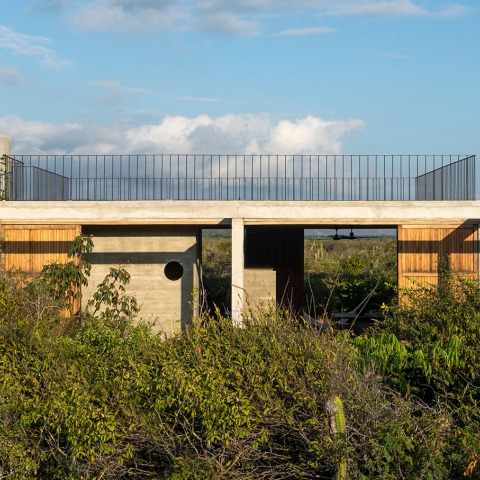 La casa se relaciona fuertemente con el paisaje por medio de una piel de celosías verticales operables de madera, lo cual también protege la casa cuando no está en uso y brinda diversos niveles de privacidad cuando está habitada. Así mismo, por la retícula exterior de concreto que abraza e incorpora la vegetación existente haciendo que los puntos entre Arquitectura y Paisaje sean indefinidos y se transformen con las estaciones y tiempos de las plantas y usos que le dan a la estructura los usuarios.