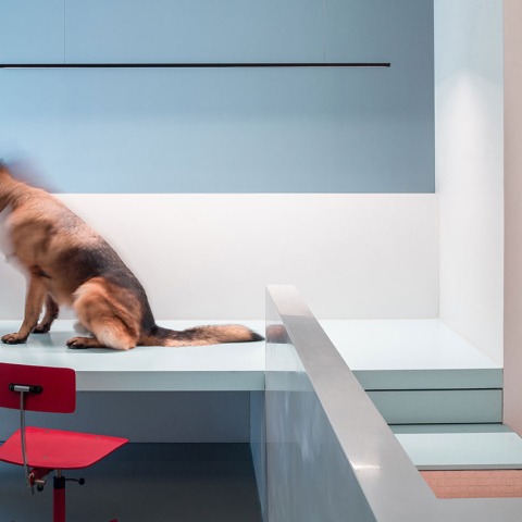 En The Dog House, el primer piso incluye la cocina, el comedor y la sala de estar, el piso subterráneo es el baño para perros y el espacio para actividades, el segundo piso está compuesto por el dormitorio principal y el área de entretenimiento. Los espacios para el propietario solo son básicamente gris, gris oscuro, gris claro y blanco; mientras que los espacios funcionales para el perro son más coloridos. Dos juegos de colores dentro de la casa: colores suaves como el azul lago, gris oscuro, azul marino y gris claro juegan con colores vibrantes, como el rosa, el amarillo de ganso y el azul celeste.