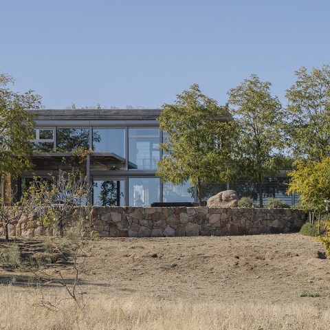 La primera pieza, una vivienda de arquitectura sencilla e luminosa, que ha sido rehabilitada con un muro cortina con control solar y fachada de lamas autorregulables, así como la incorporación de unos árboles de hoja caduca que protegerán la vivienda del sol estival, dejándolo pasar en invierno.