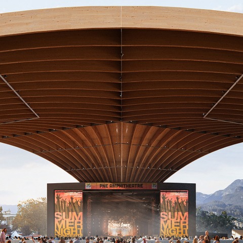 El Anfiteatro PNE / Arco Móvil Libertad de Revery Architecture exhibirá madera maciza en una cubierta de arco estrella sin precedentes. El proyecto aprovecha el potencial acústico único y el carácter biofílico de la madera maciza para ofrecer una experiencia inolvidable a artistas y público de hasta 10 000 personas. El Anfiteatro será el primer proyecto cultural con cero emisiones netas de carbono de Vancouver y albergará el FIFA Fan Festival™ durante el Mundial de 2026 en Vancouver.