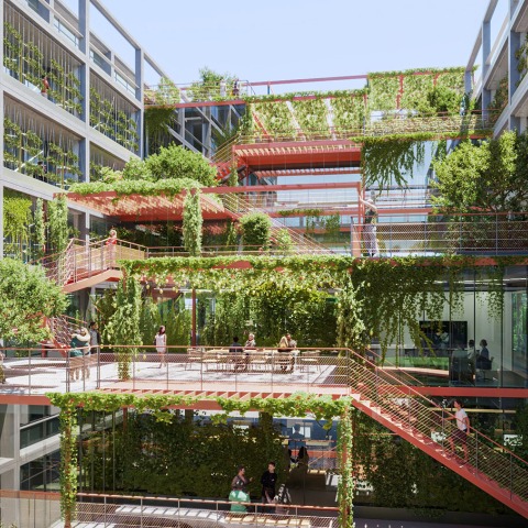 Las pérgolas median entre plataformas situadas a diferentes alturas, al tiempo que interconectan el espacio exterior con los entornos de trabajo y las áreas de laboratorio ubicadas en las alas externas del edificio de diversas maneras. Gracias a la cuadrícula estructurada, las alas se pueden dividir y utilizar de forma flexible, lo que permite una amplia gama de usos en el futuro. Un puente conecta los dos bloques con la orilla del río. Alberga espacios de coworking y ofrece vistas al río Spree y al huerto. Las salas de reuniones incorporadas a las terrazas del jardín ofrecen vistas a la granja vertical. En esta estructura se cultivan lechugas y hierbas que alcanzan una altura de hasta nueve metros, algunas de ellas en una configuración completamente automatizada. El proceso de acuaponía establece un ciclo natural que utiliza agua rica en nitratos procedente de la piscicultura como fertilizante para el crecimiento de las plantas.