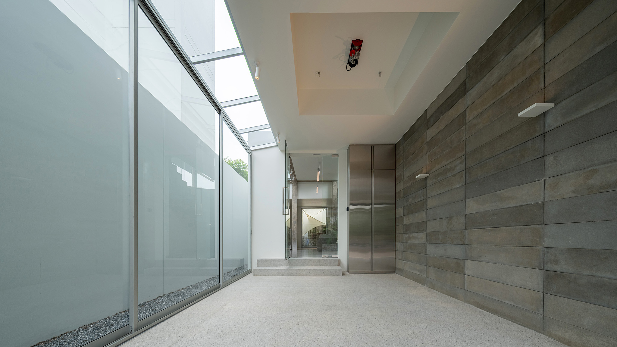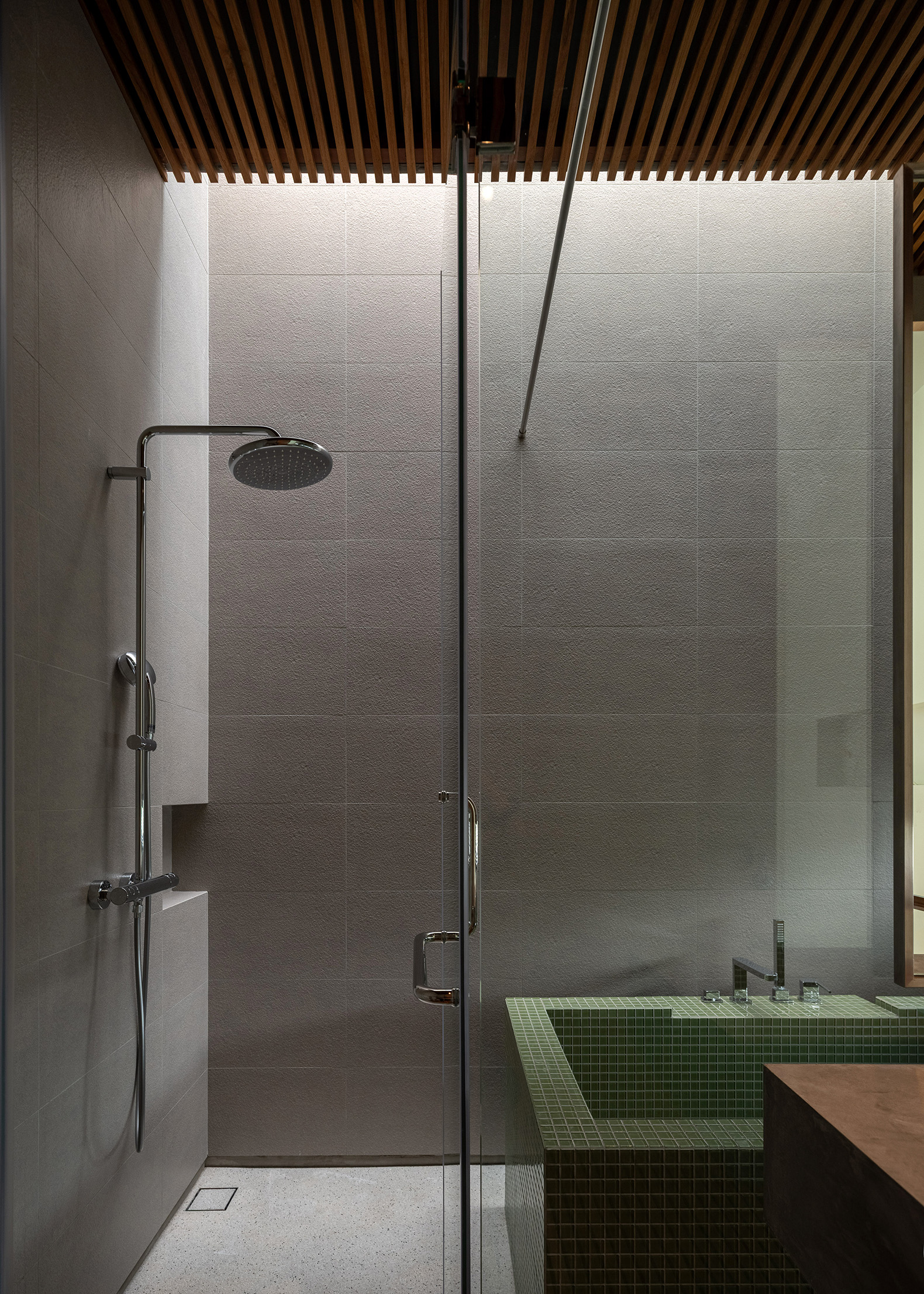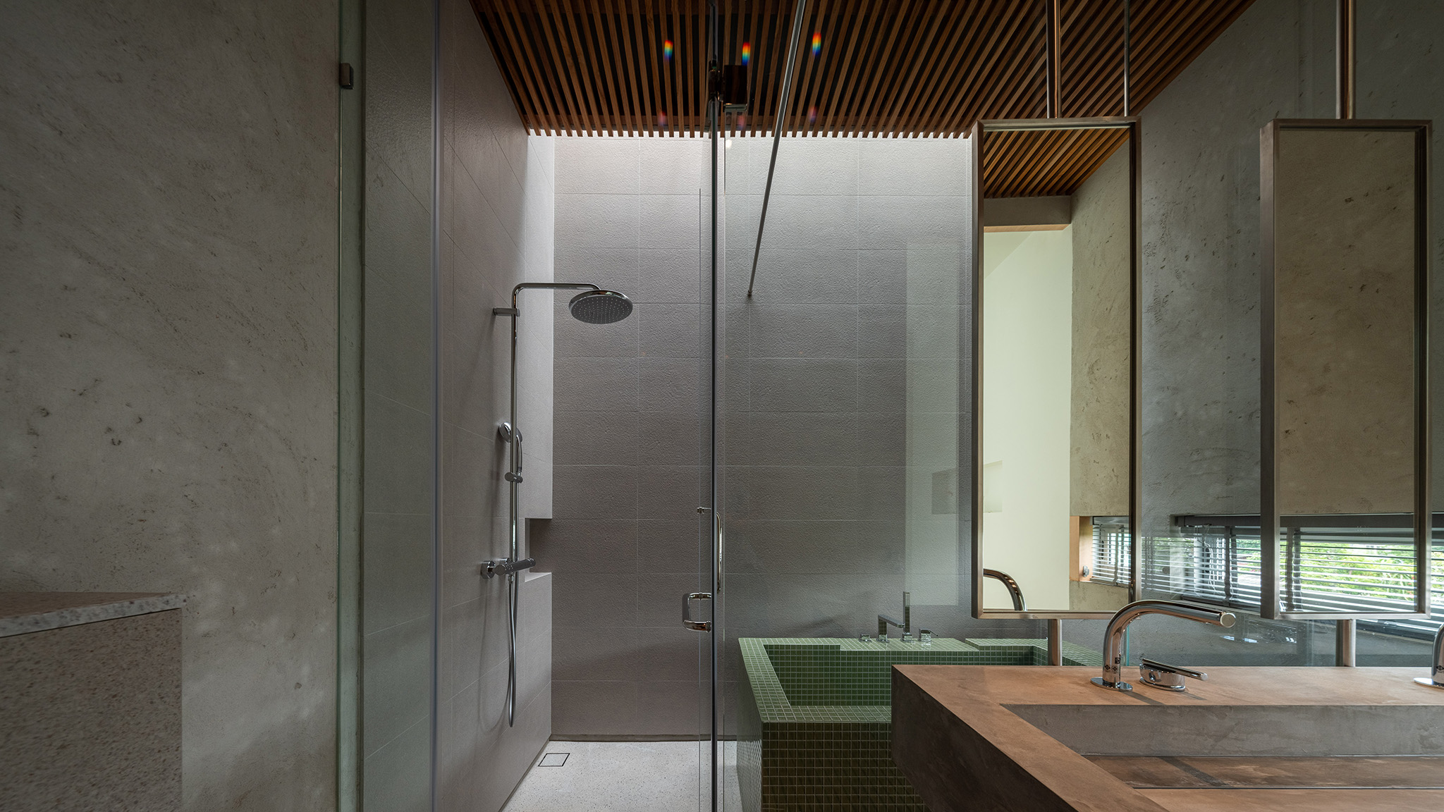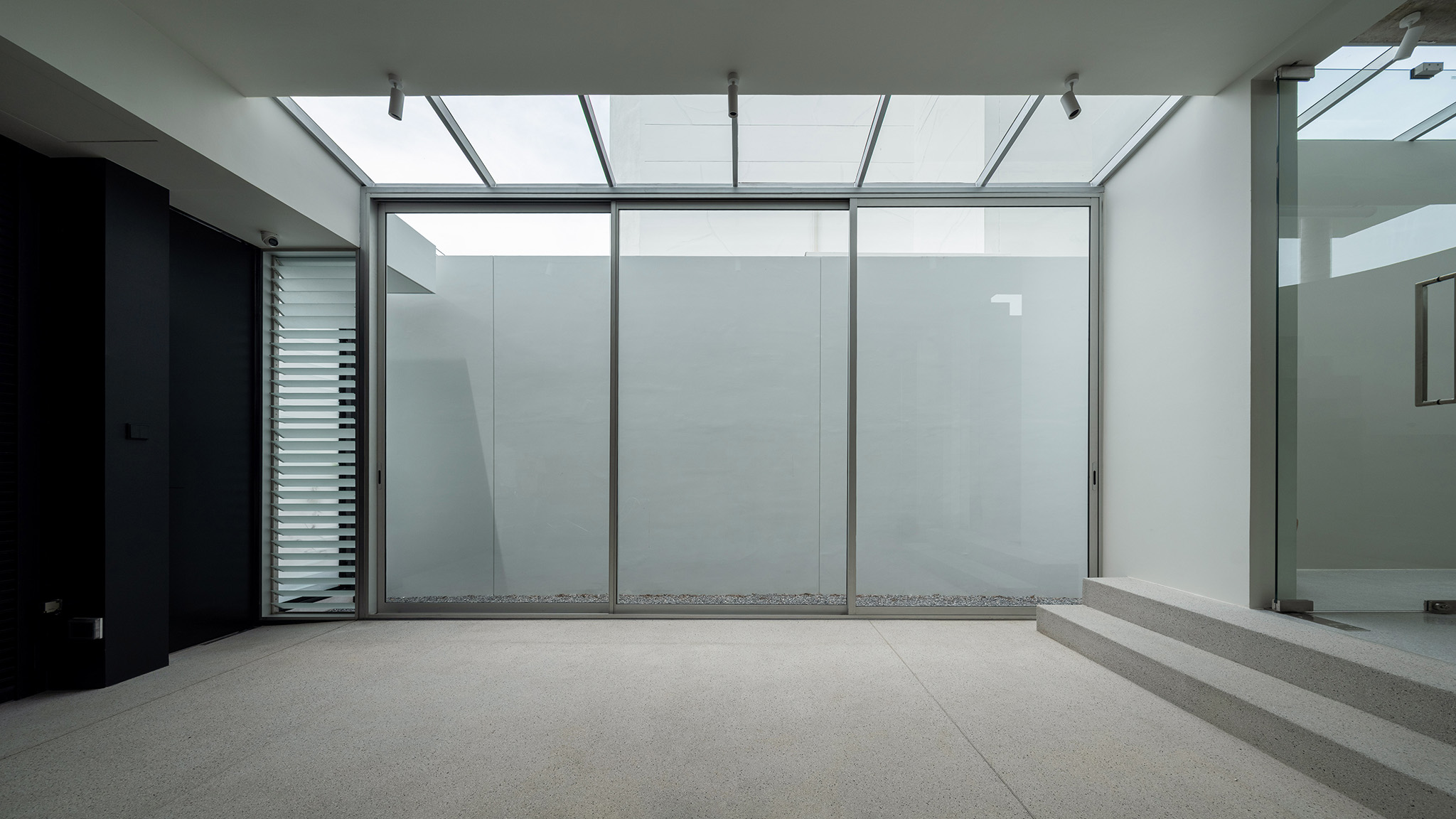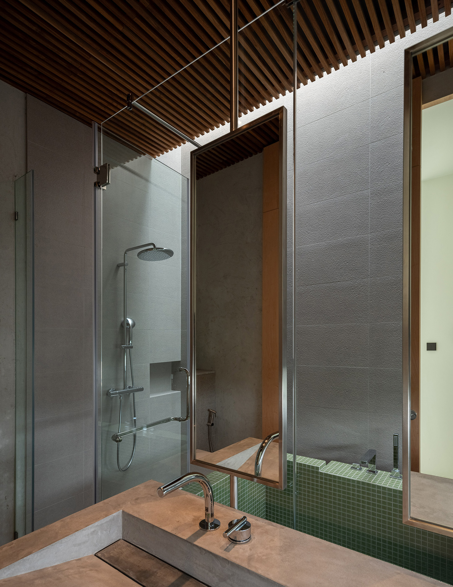Un nivel intermedio sobre la sala de estar está dedicado a un baño, diseñado como un remanso de paz donde la luz natural se filtra a través de aberturas altas para crear una atmósfera serena. La tercera planta alberga un vestidor, ubicado como un espacio intermedio entre la sala de estar y las zonas privadas. Finalmente, la planta superior alberga el dormitorio, que se abre a un balcón, ofreciendo privacidad a la vez que conecta a los ocupantes con las vistas y el cielo circundantes. La casa se define por su estructura de hormigón con columnas y vigas. La interacción de la luz natural a través del tragaluz y la circulación vertical da vida a los interiores, haciendo que cada nivel sea único pero a la vez interconectado.