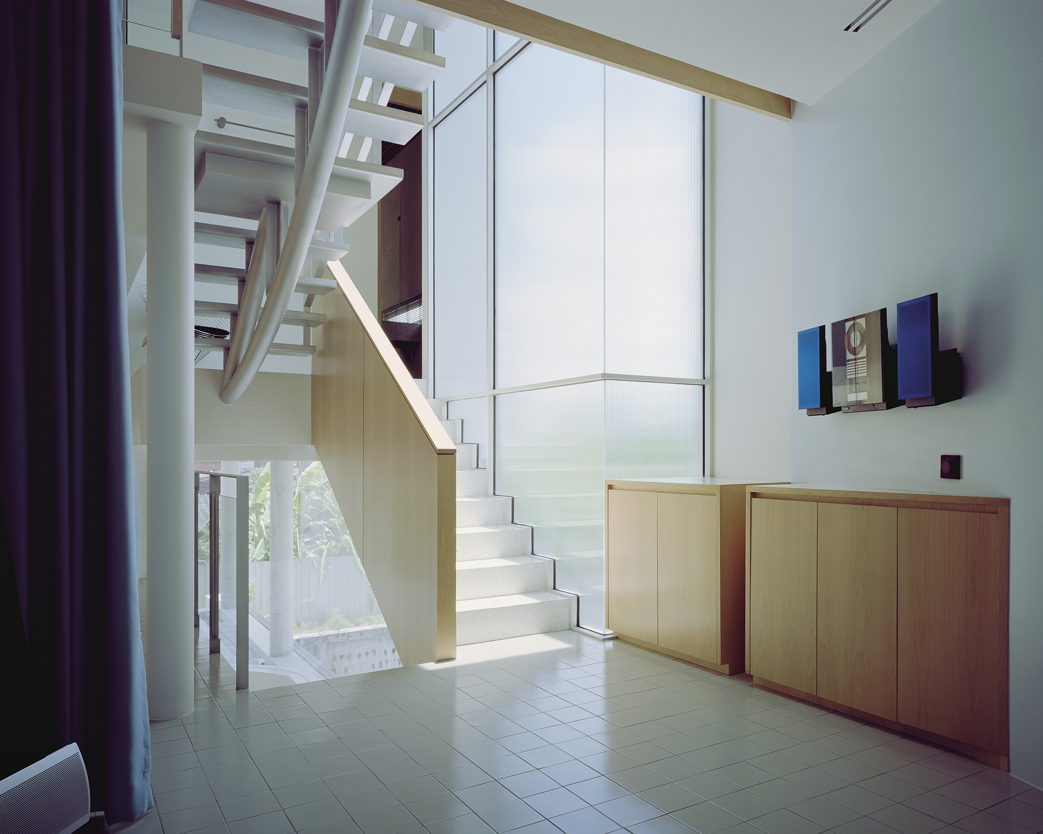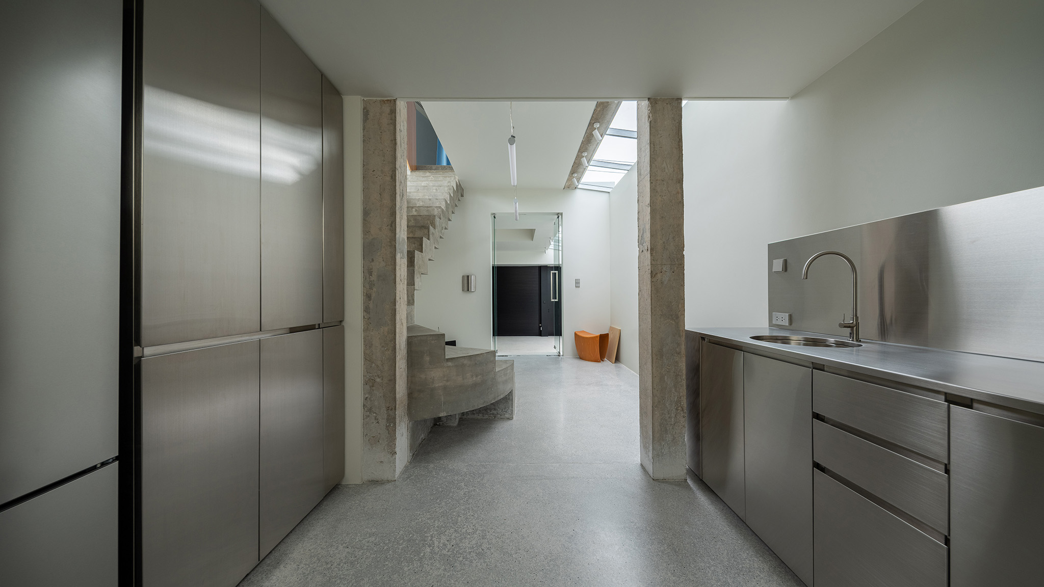 Facilitando eficientemente las rutinas diarias, el recorrido espacial comienza con el comedor y la cocina en planta baja. Al ascender, una amplia sala de estar constituye el espacio de reunión familiar. La planta superior aloja el dormitorio, que se complementa con un balcón donde los ocupantes de la casa conectan con el cielo circundante. Apilando las diferentes funciones en seminiveles, la propuesta logra transformar el estrecho y restringido terreno urbano en un espacio doméstico, acogedor y fluido.