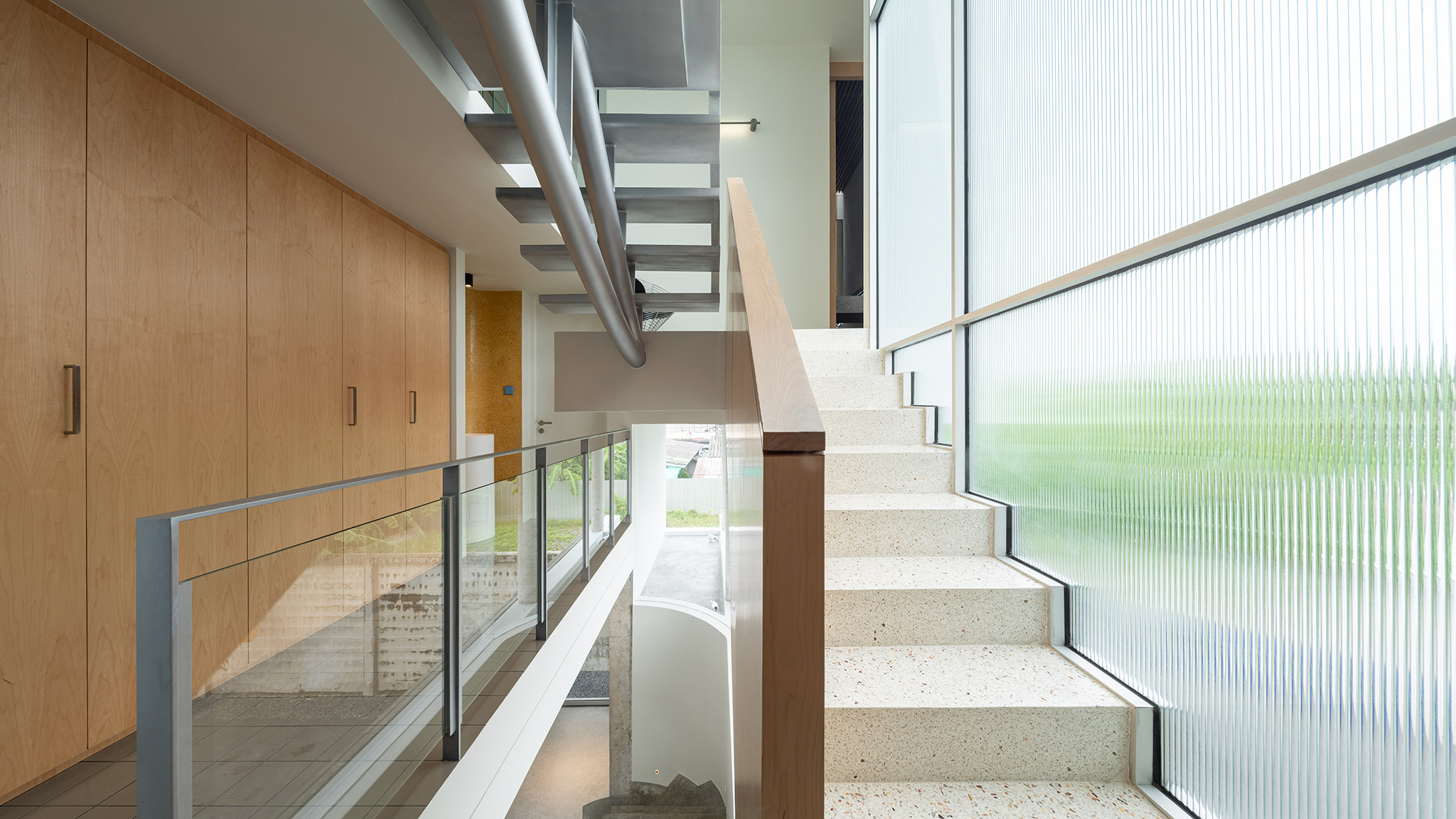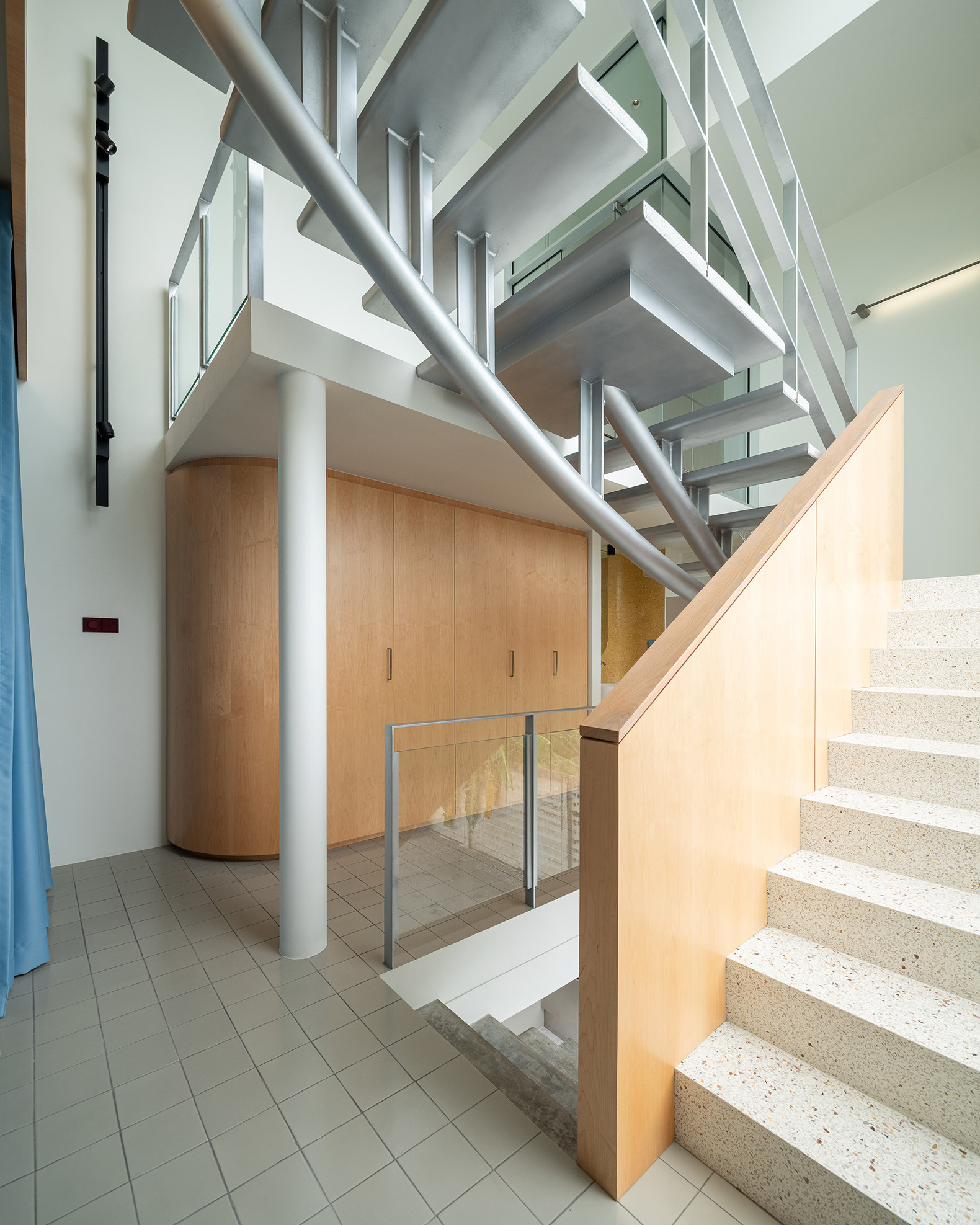 Casa AA transforma el desafío de una fachada estrecha y una parcela urbana profunda en una secuencia vertical de espacios interconectados. El diseño se organiza en torno a una escalera central, que conecta una serie de seminiveles que guían el movimiento de forma gradual, en lugar de abrupta. Esta circulación escalonada genera un ritmo de vistas superpuestas, lo que hace que la casa se sienta abierta y conectada a pesar de su tamaño compacto.
