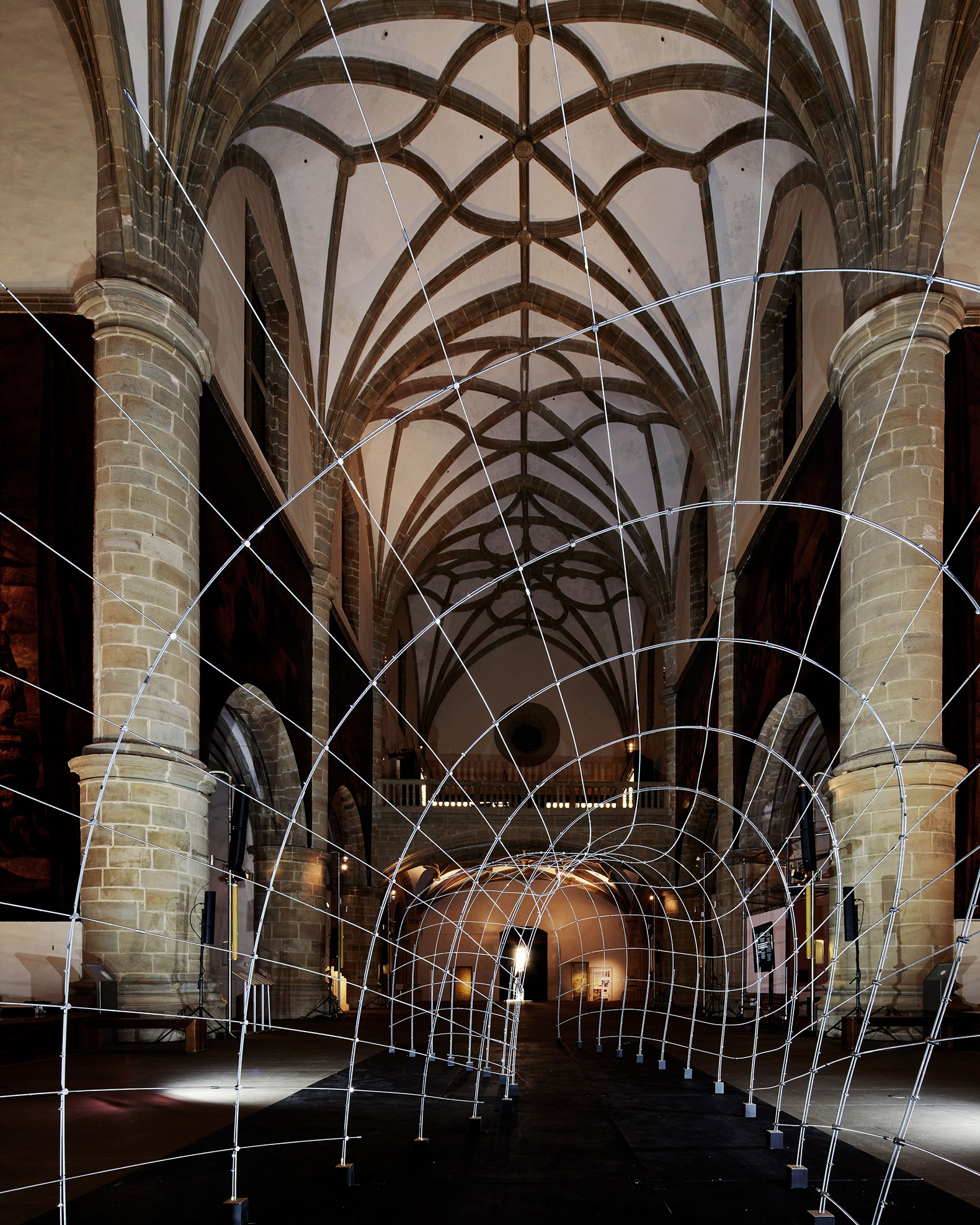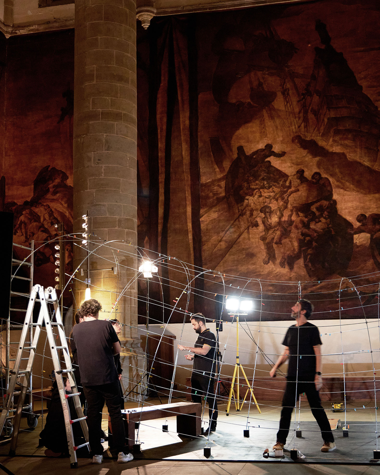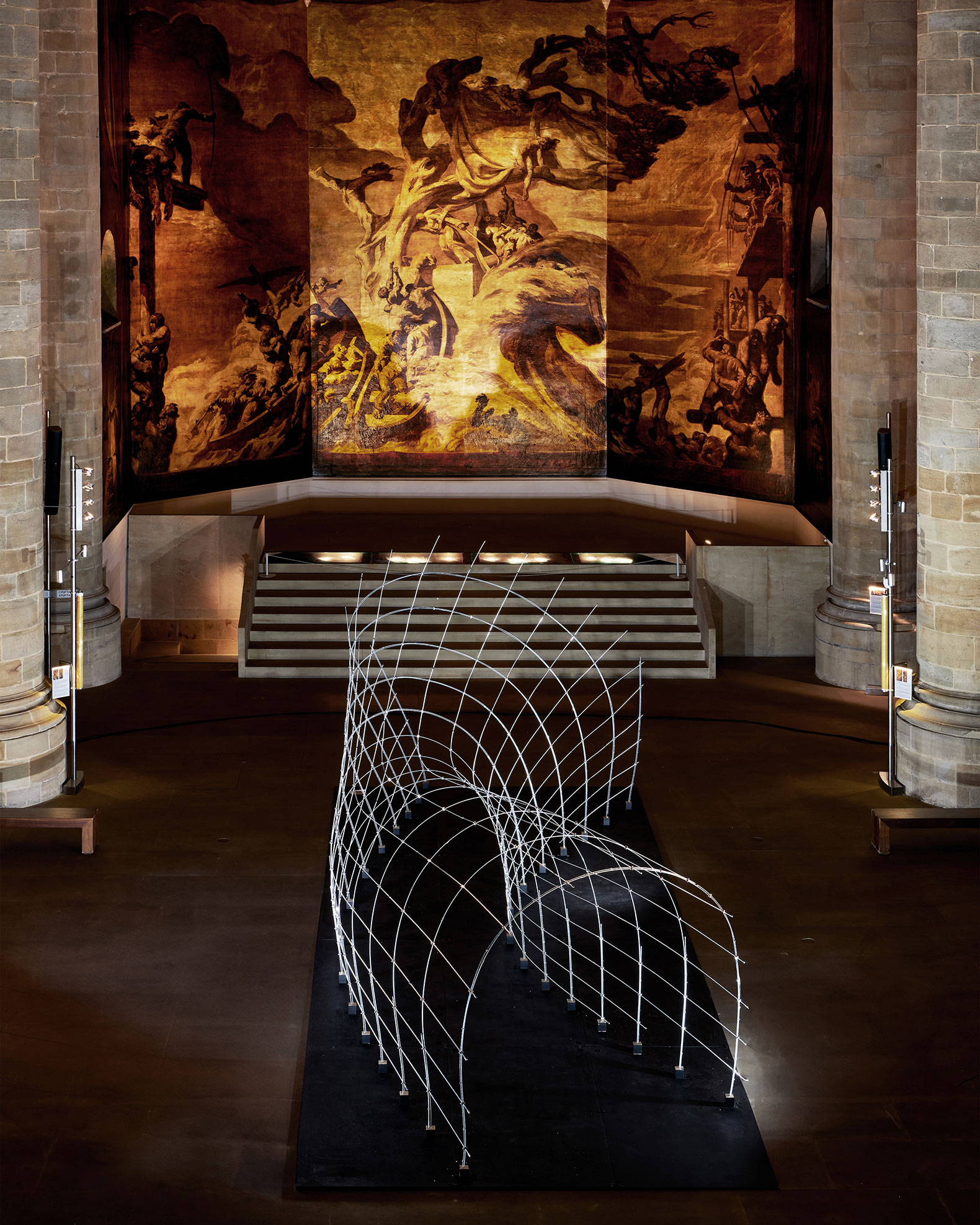 El espacio elegido para la construcción es la nave de la Iglesia del Museo de San Telmo, antiguo convento franciscano de la ciudad de San Sebastián, hoy Museo Antropológico. El lugar, casi mágico, permite la superposición visual de las lineas que conforman el pabellón con las nervaduras de las bóvedas que cubren la nave.