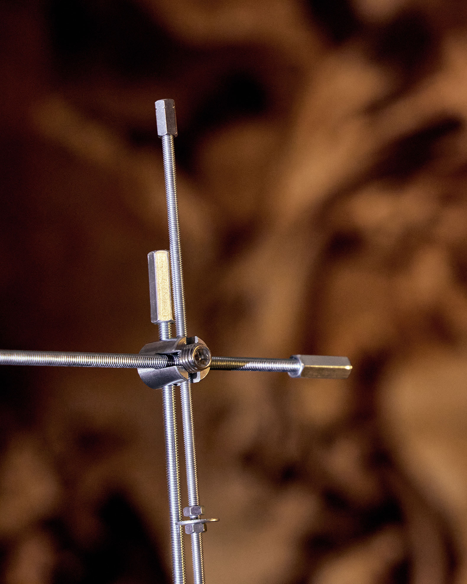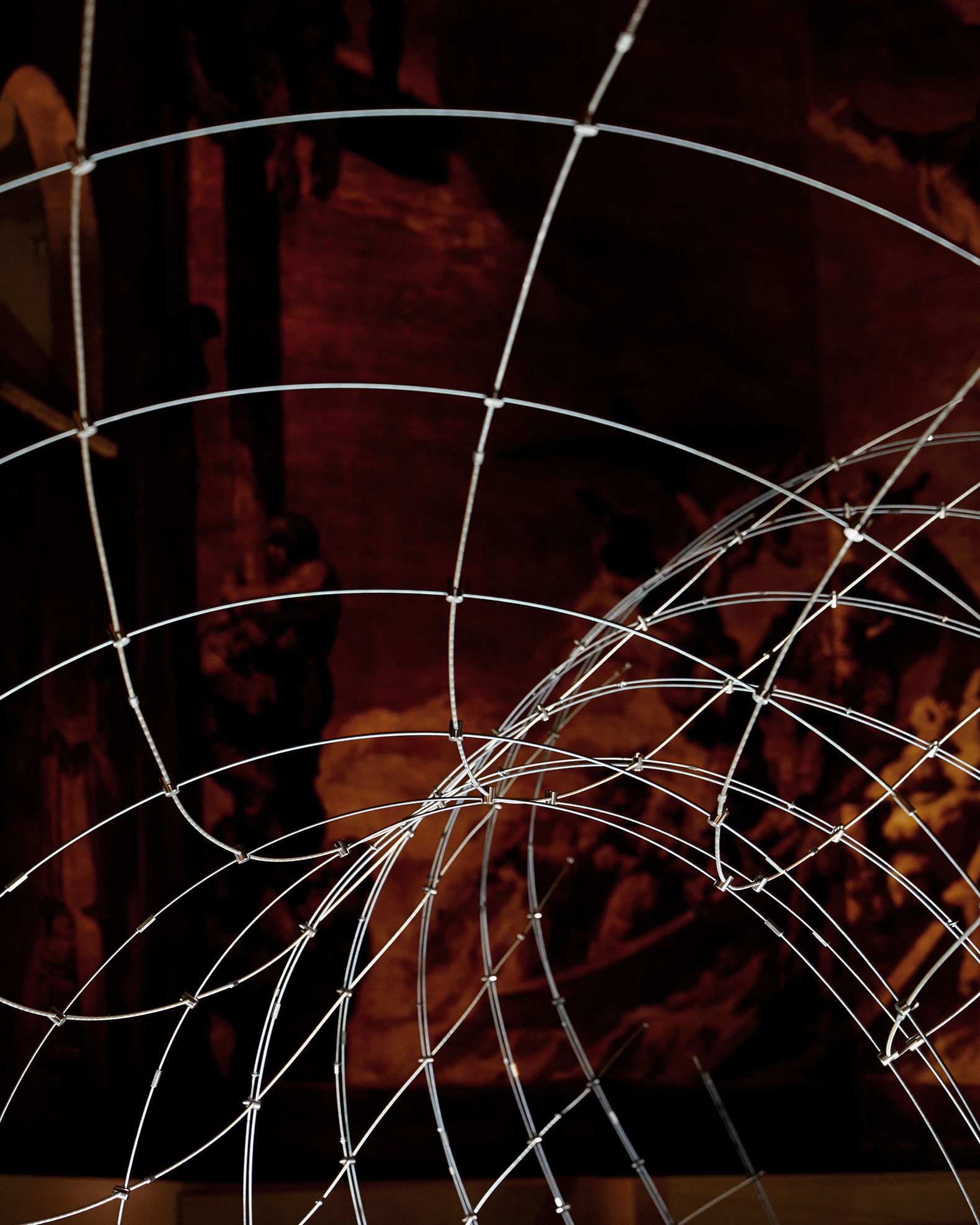 Se utilizaron dos materiales básicos: varillas de acero galvanizado de 6 mm de diámetro y nudos iguales de acero que fijan ortogonalmente las barras. Para su montaje, se combinó la precisión digital de la realidad aumentada y la materia física de la arquitectura paramétrica, desarrollando un sistema aplicable a cualquier tipo de superficie que siga el mismo sistema de generación.