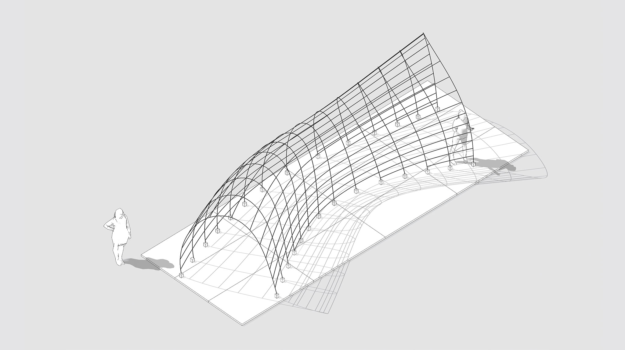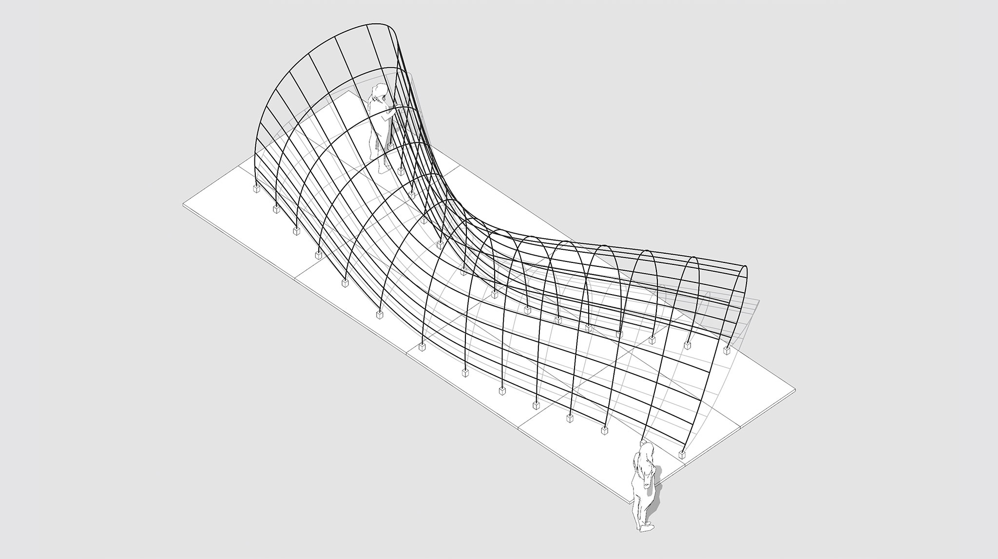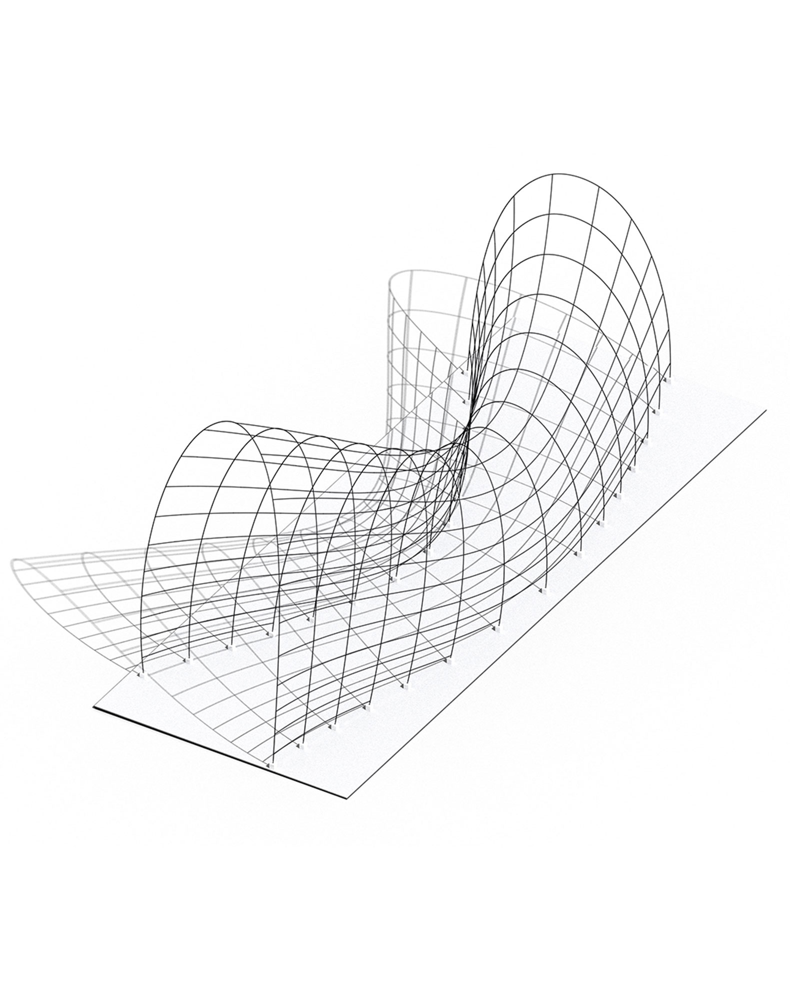 Fundamentado en el principio geométrico de la Superficie de Monge, el proyecto genera un recorrido alineado con el eje de la nave donde se sitúa, cubierto por una superficie de doble curvatura discretizada por un entramado de curvas alabeadas.