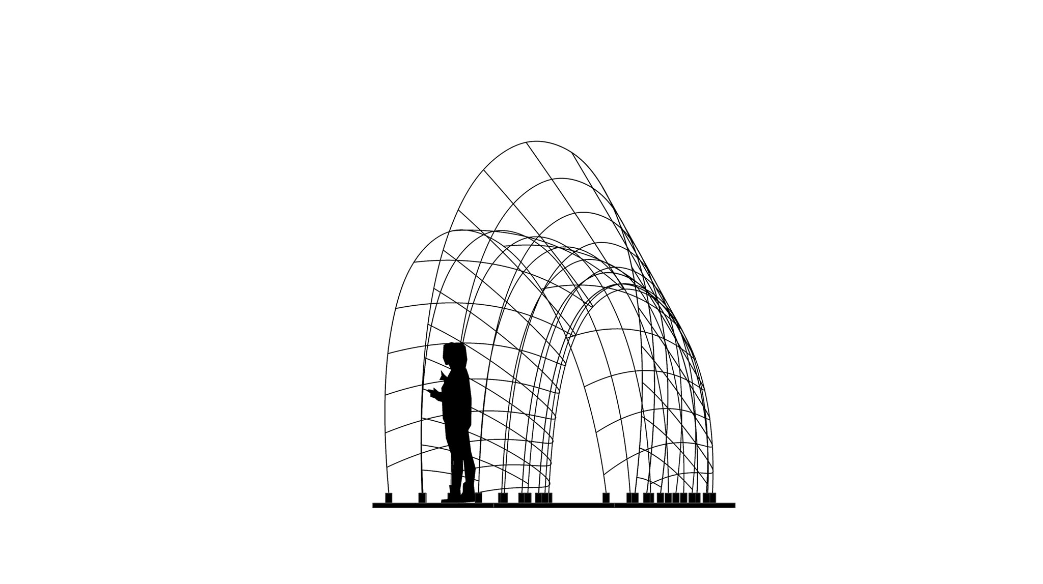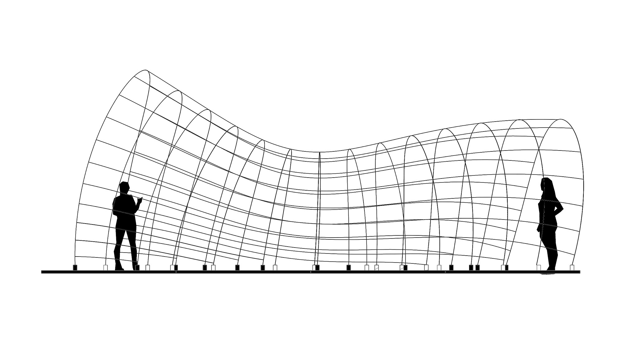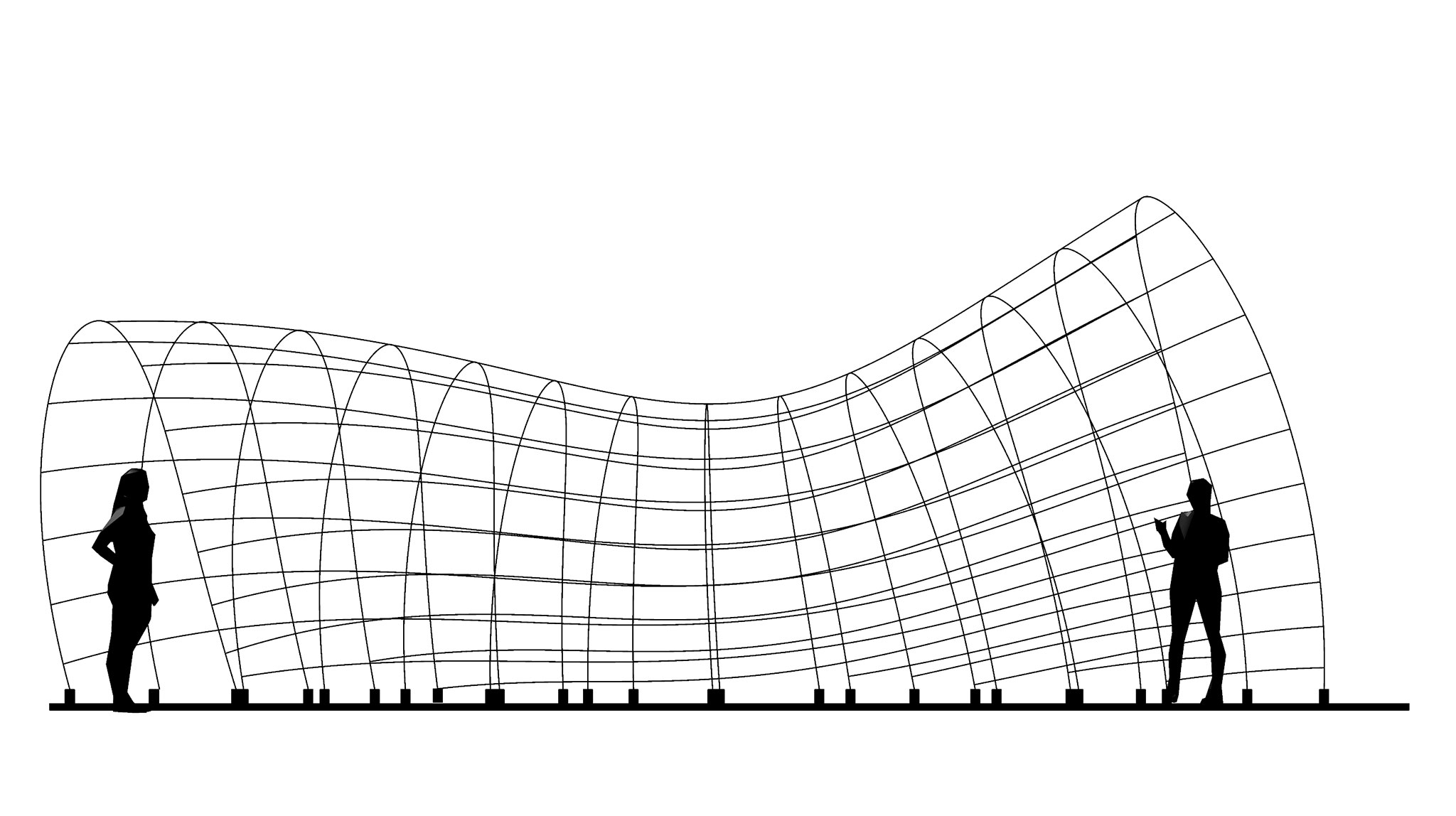 Fundamentado en el principio geométrico de la Superficie de Monge, el proyecto genera un recorrido alineado con el eje de la nave donde se sitúa, cubierto por una superficie de doble curvatura discretizada por un entramado de curvas alabeadas.