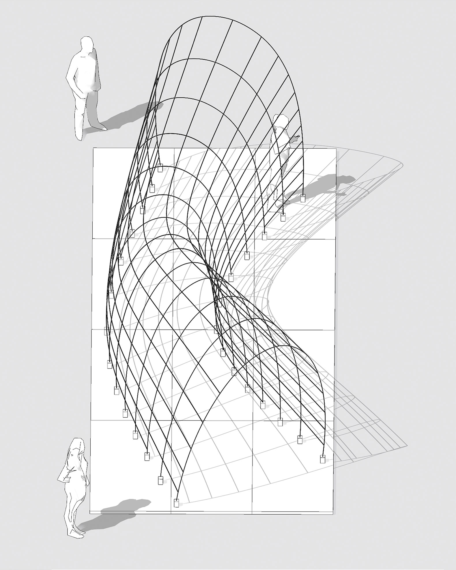 Es el resultado de una investigación previa sobre la construcción de superficies de forma libre mediante el uso de sistemas constructivos sencillos. En este caso se utilizan unicamente dos materiales básicos, varillas de acero galvanizado de 6 mm. de diámetro y nudos también de acero todos iguales, que permiten fijar ortogonalmente las barras, aprovechando las características de un mismo principio geométrico de generación.