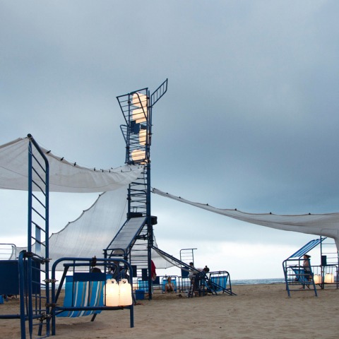 El reducido presupuesto nos llevó a pensar en trabajar con materiales que nos pudiera proporcionar el ayuntamiento local. Las vallas de obra fueron el elemento escogido por su resistencia y modulación, lo que facilitó tanto su transporte como su transformación en taller. Las piezas se ensamblaron en la playa formando una estructura rígida que se completó con la instalación eléctrica (iluminación, wifi y equipo de sonido) y la incorporación de elementos textiles para la protección solar. El resto lo puso el usuario.