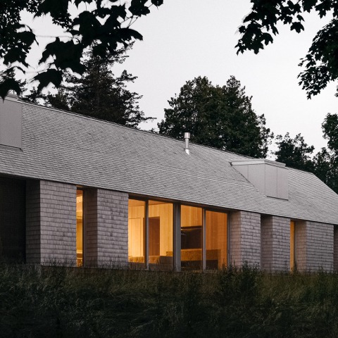 Si bien la secuencia espacial y el concepto de ubicación son bastante contemporáneos, la forma y la materialidad del proyecto se inspiran en la arquitectura más agraria de la zona. El ladrillo y el cedro celebran la dualidad del sitio. Se utiliza ladrillo en la pared maciza que sostiene la ladera en la que se encuentra la casa, mientras que un techo de cedro envuelve la fachada que mira al agua, entablando un diálogo con los árboles que enmarcan las vistas del lago. El interior está completamente revestido con tablas de abeto Douglas, con paredes de ladrillo que dialogan con la tectónica exterior.
