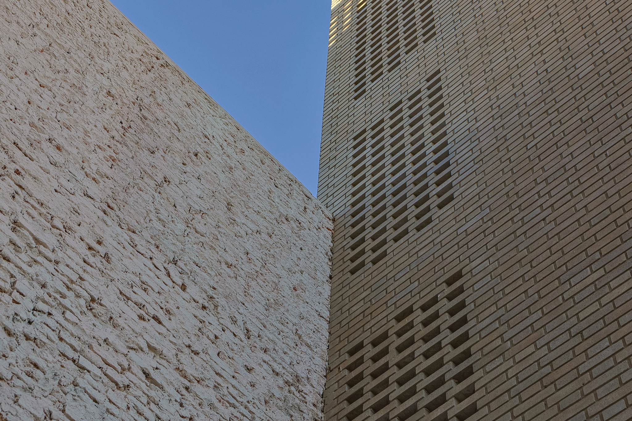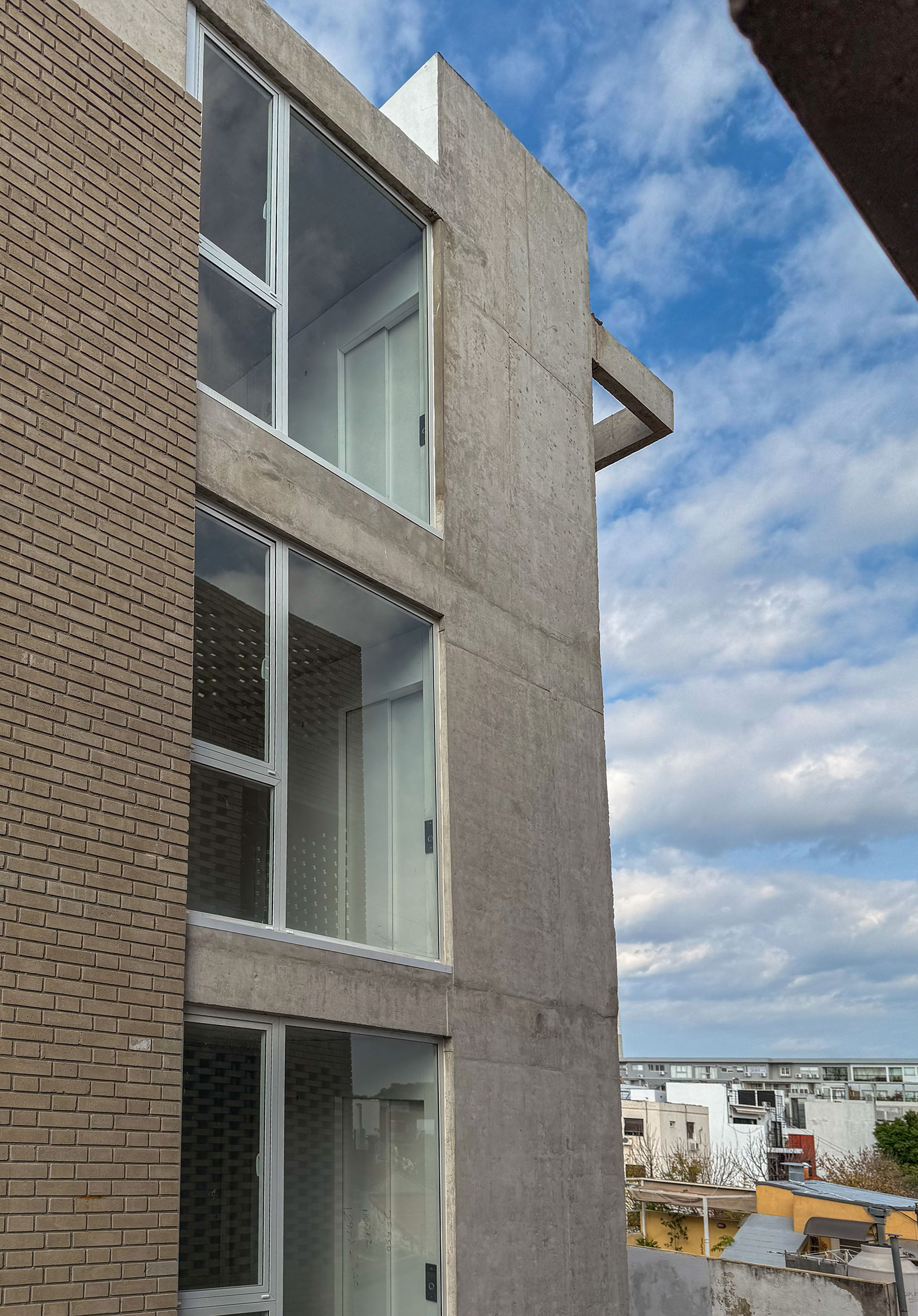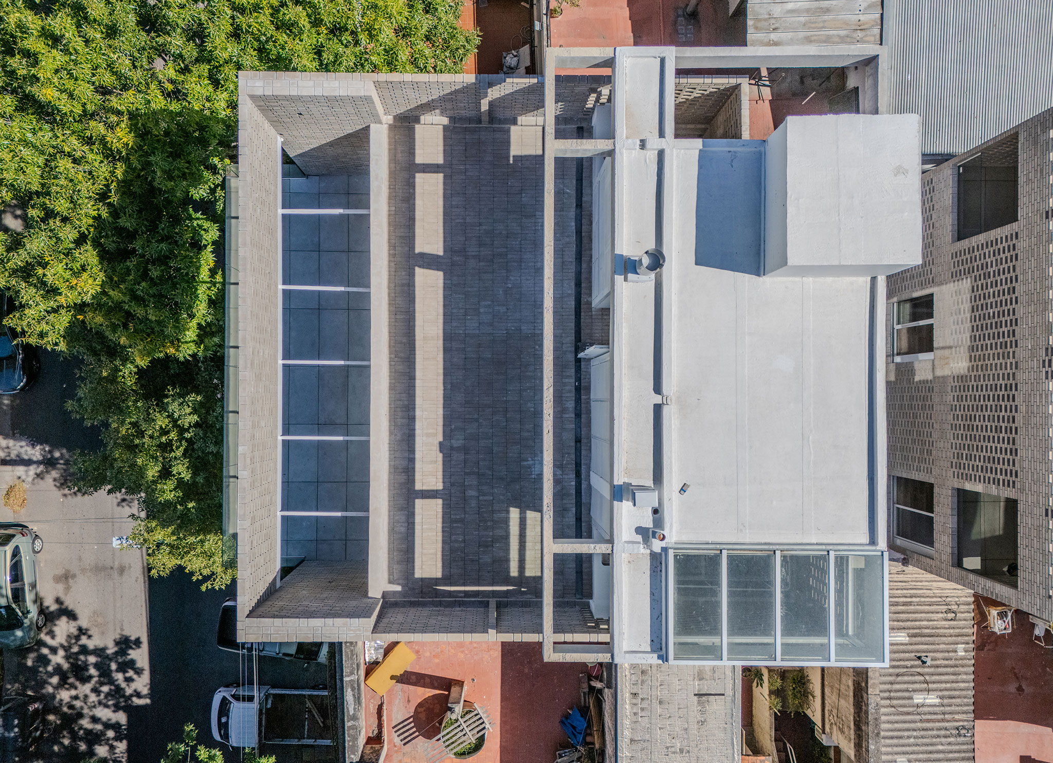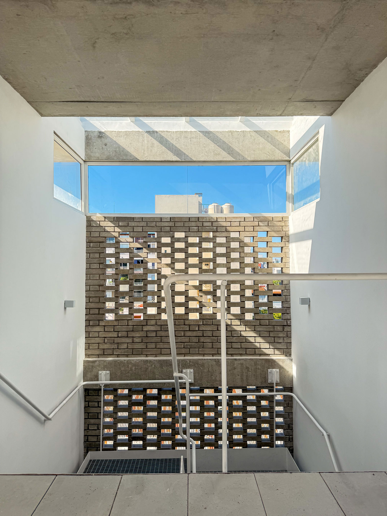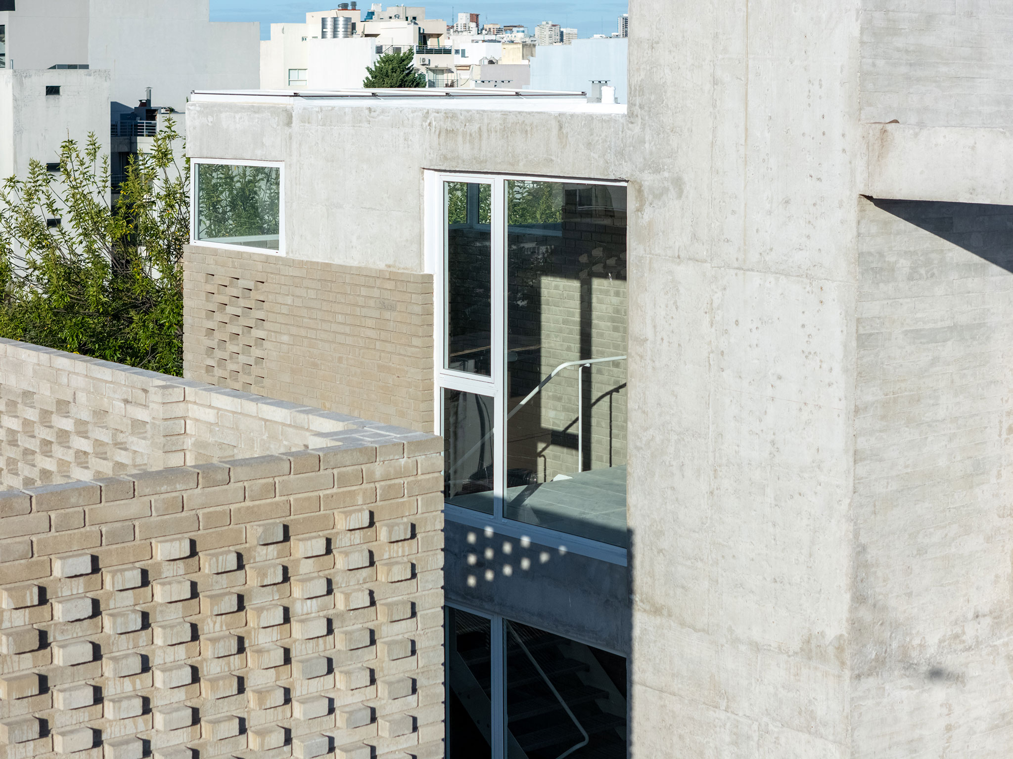El edificio, de esta manera, maximiza su capacidad constructiva, a partir de una envolvente mono material utilizando el ladrillo Bricko de Corblock. En ese sentido se permite una experimentación material a partir de diversas operaciones morfológicas precisas (repetición, sección, vinculación) para asumir su propia complejidad, e investigar los encuentros, las disposiciones, los modos de unión y las fijaciones con la intención de configurar una atmósfera deseada (luz y espacio en una interpelación constante).