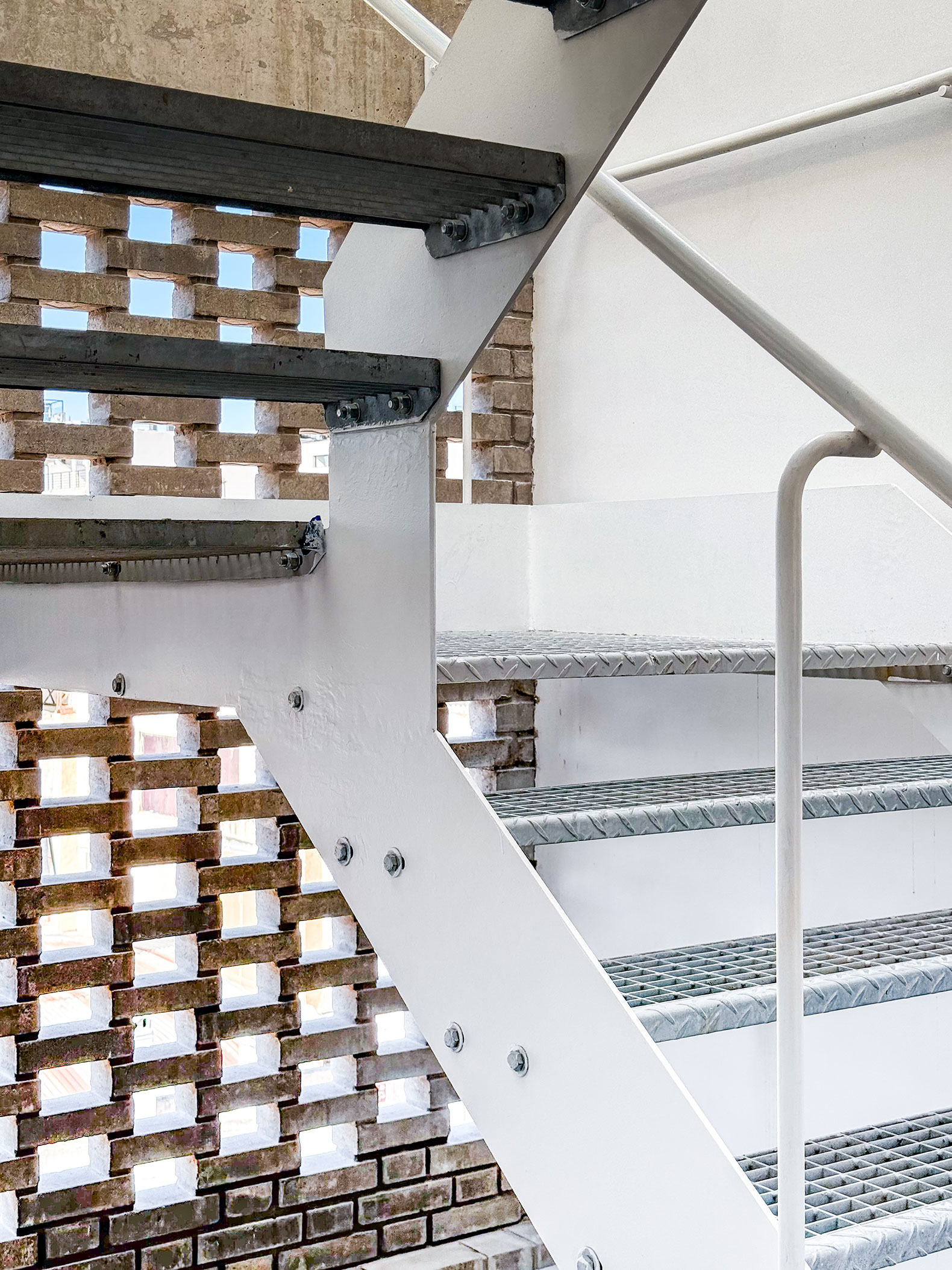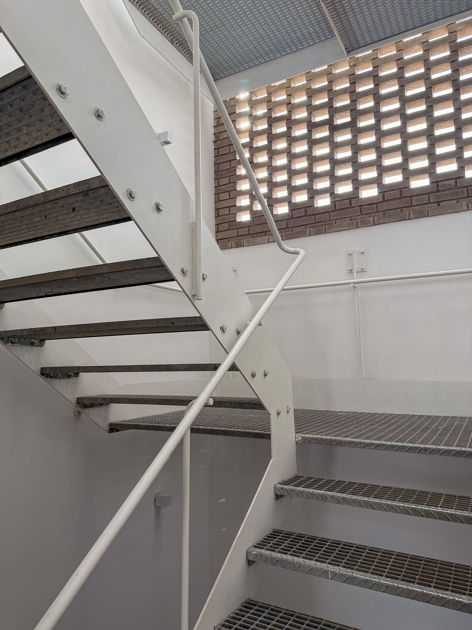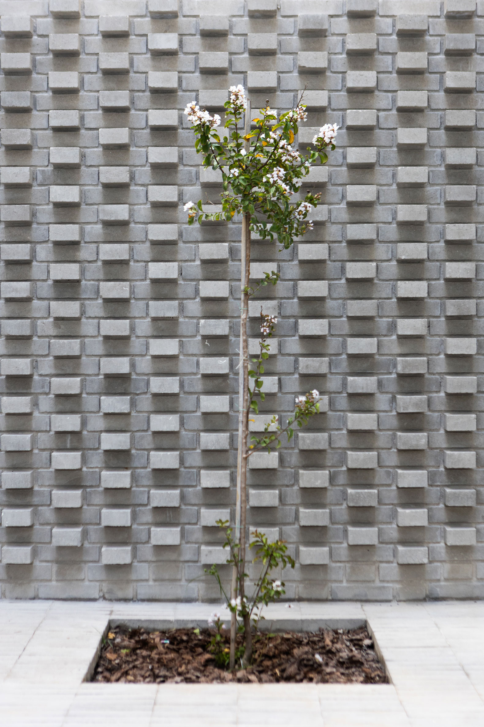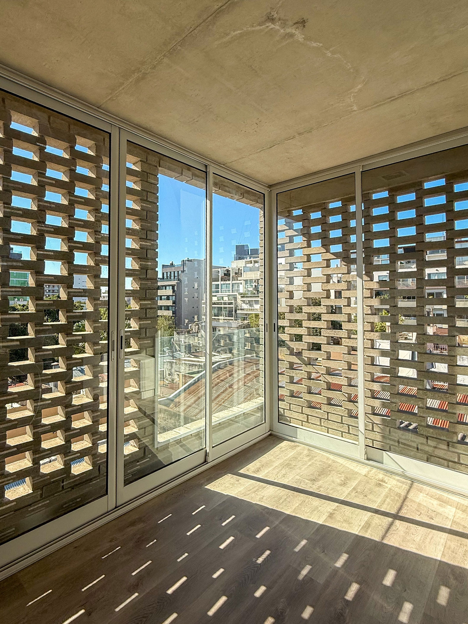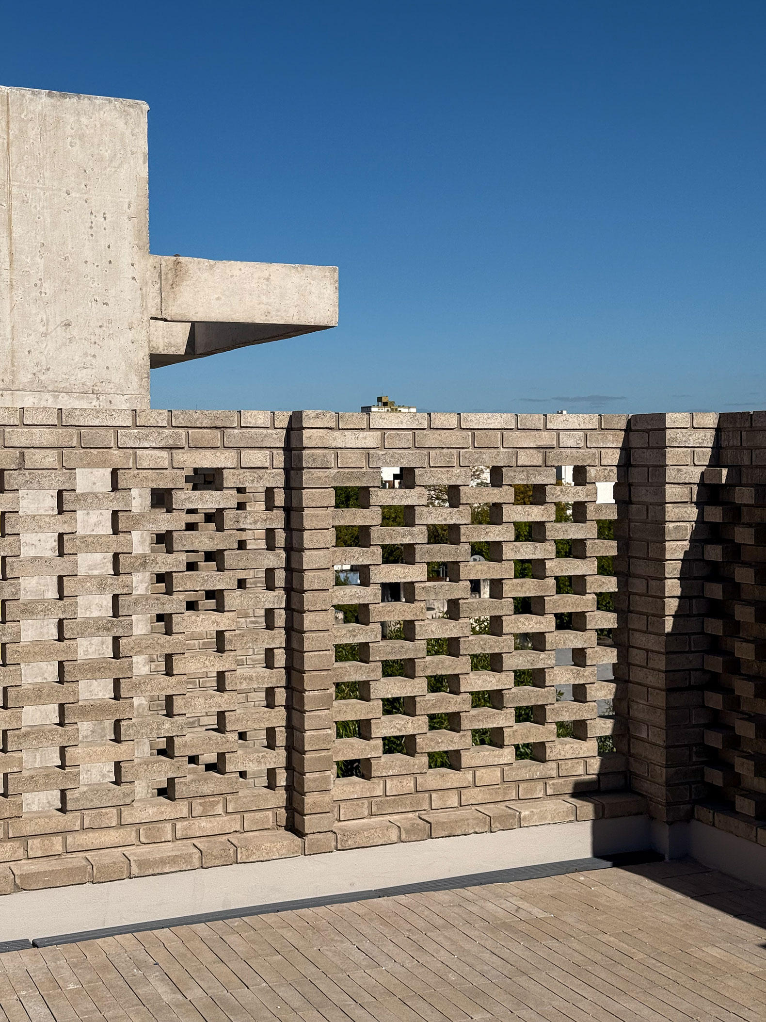 El edificio, de esta manera, maximiza su capacidad constructiva, a partir de una envolvente mono material utilizando el ladrillo Bricko de Corblock. En ese sentido se permite una experimentación material a partir de diversas operaciones morfológicas precisas (repetición, sección, vinculación) para asumir su propia complejidad, e investigar los encuentros, las disposiciones, los modos de unión y las fijaciones con la intención de configurar una atmósfera deseada (luz y espacio en una interpelación constante).