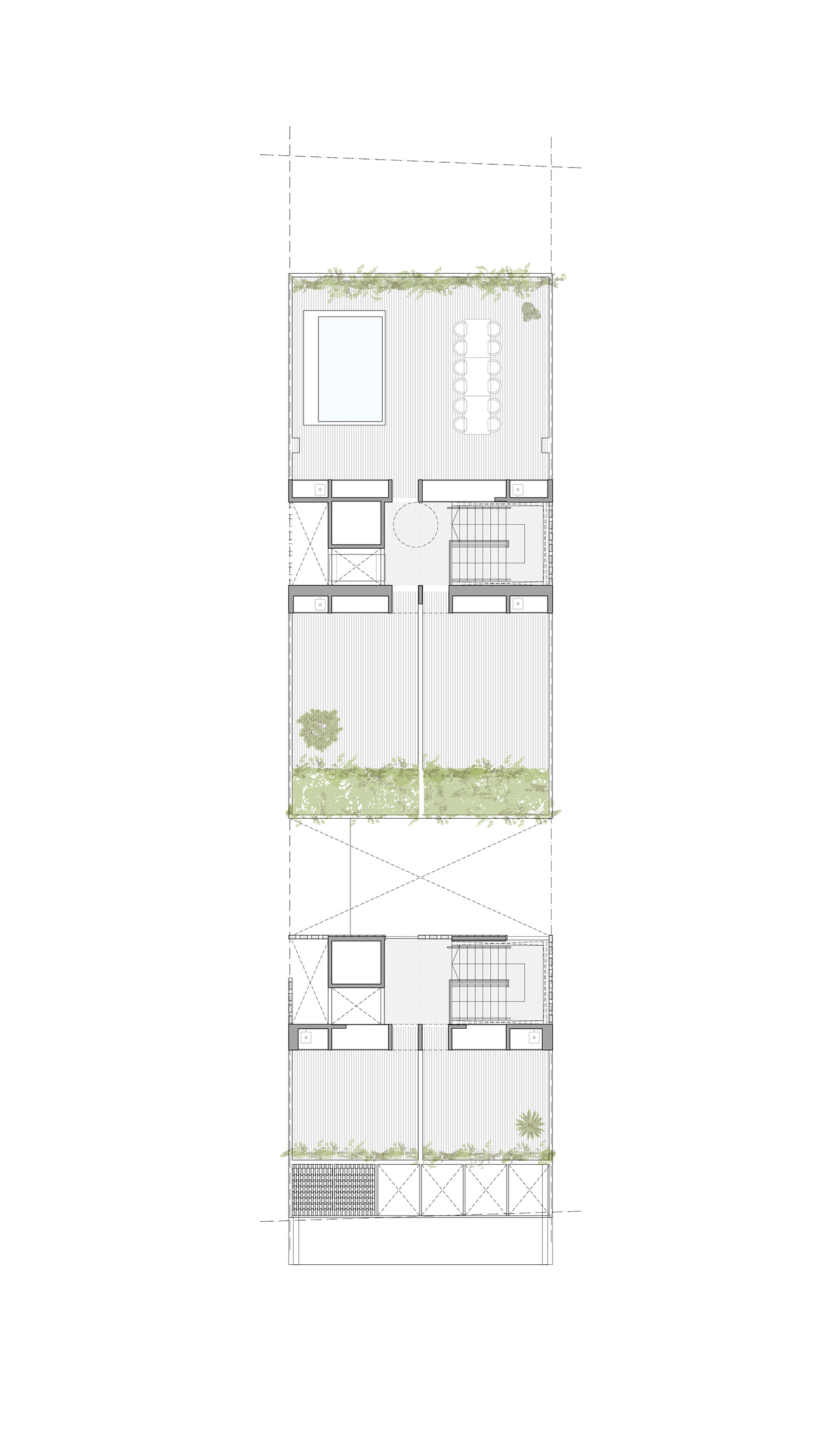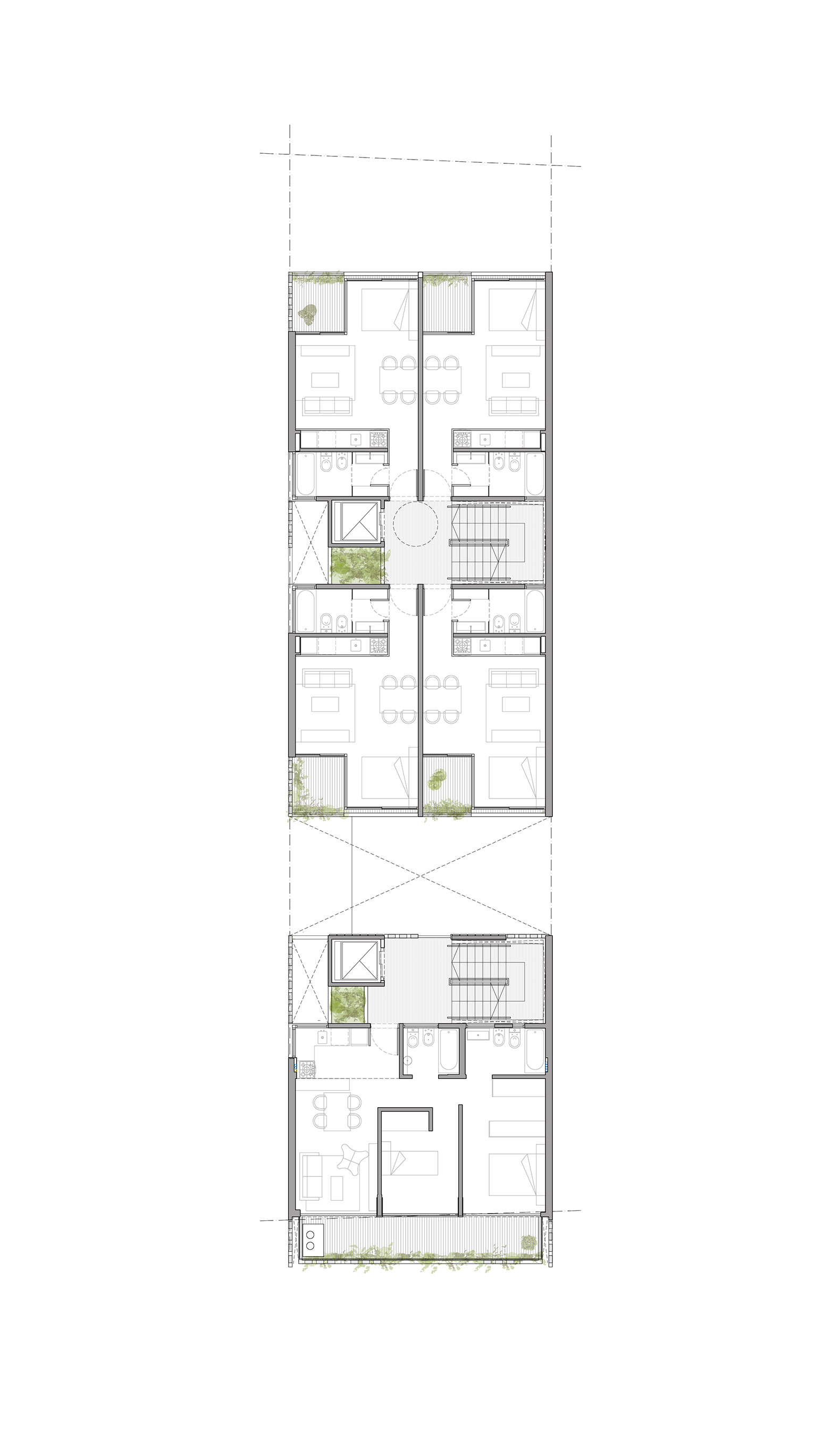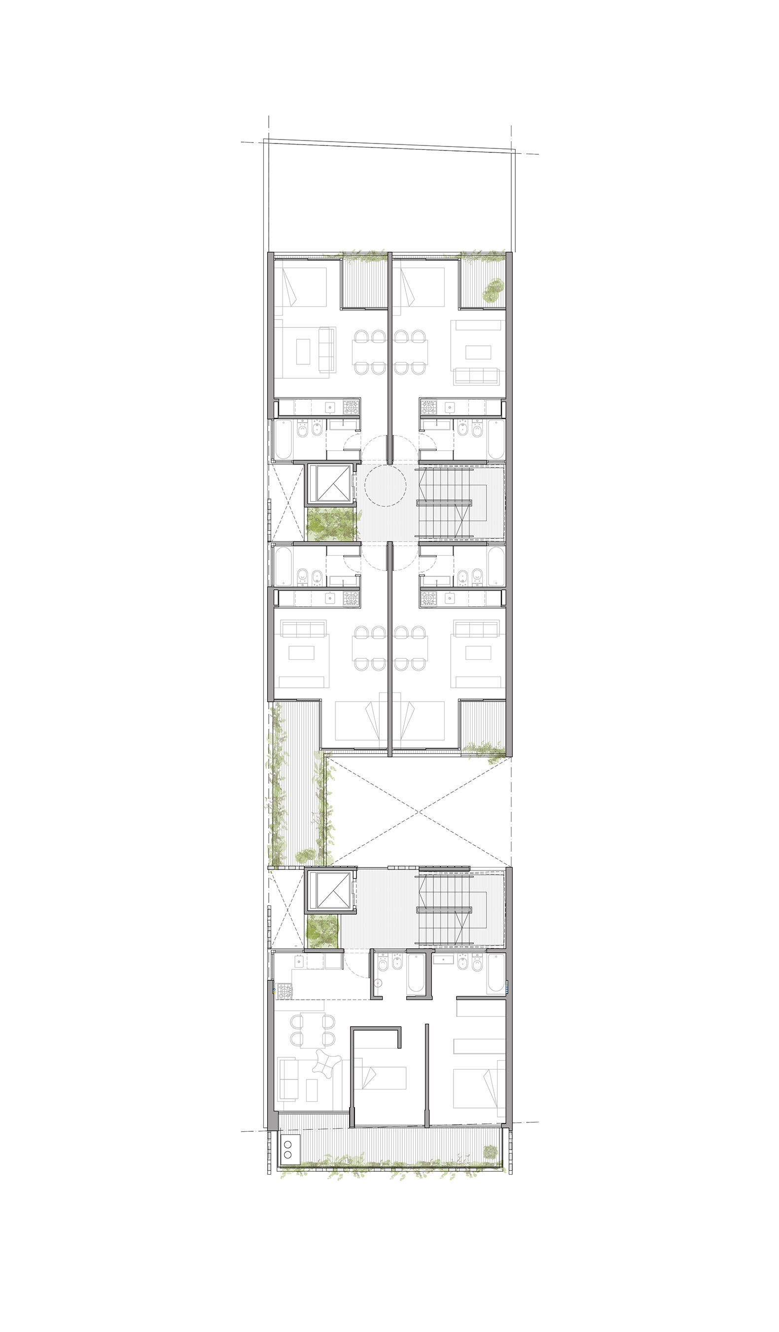 Alineado con los diversos modos de habitar contemporáneos, NÑZ 3949 propone una serie de tipologías habitacionales que responden tanto al concepto de familia tipo como a nuevos núcleos de convivencia. Desarrollada en planta baja y cuatro niveles, la propuesta de vivienda colectiva se resume en una volumetría permeable que, implementando un monomaterial, logra complejas disposiciones que configuran las diferentes atmósferas deseadas.