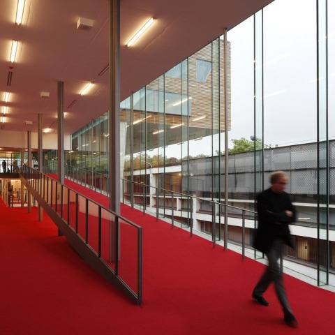 The design of the building incorporates a range of simulating processes. Spacious circulations carry the audience along the outer sides of the building. Large windows overlook the urban landscape and the ring road, maintaining contact with the outside world. At the same time the visitor is exposed to the inner working of the building through overlapping spaces, unexpected depth views and perspectives.