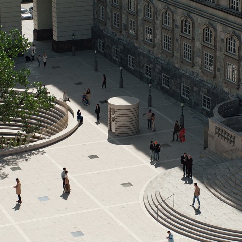 The courtyard is the scene of daily life in Parliament: demonstrations, public speeches, media interviews and much more. The new amphitheatre stairs are a place to gather and observe the dynamic daily life of the square, meet before or after a visit, and be a natural meeting point for a group introduction to the Danish Parliament. At the foot of the stairs is 'The People's Tree', an imposing solitary tree that symbolizes the roots of democracy. Unifying, level-free paving within the Parliament Courtyard of existing and reused granite slabs provides flexibility and universal accessibility to the Parliament complex.