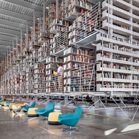 The new library is four levels of massed stacks with shelves of books suspended as a centerpiece. The collection is surrounded by new spaces for research, computing, and instruction as well as a reading and study space.