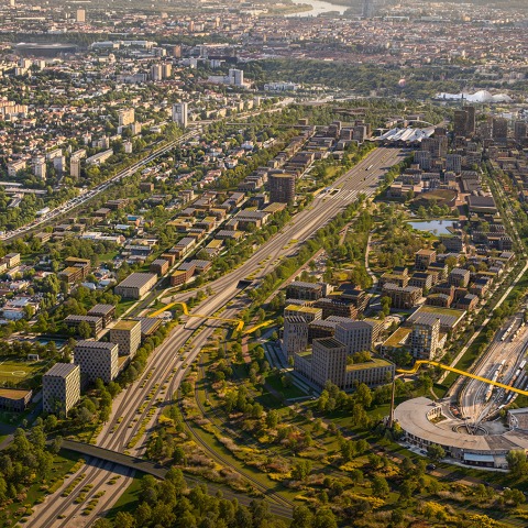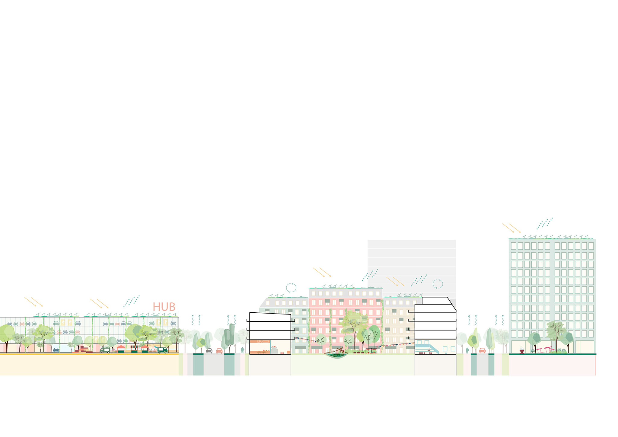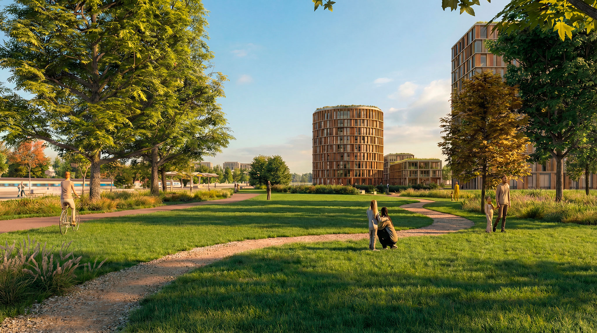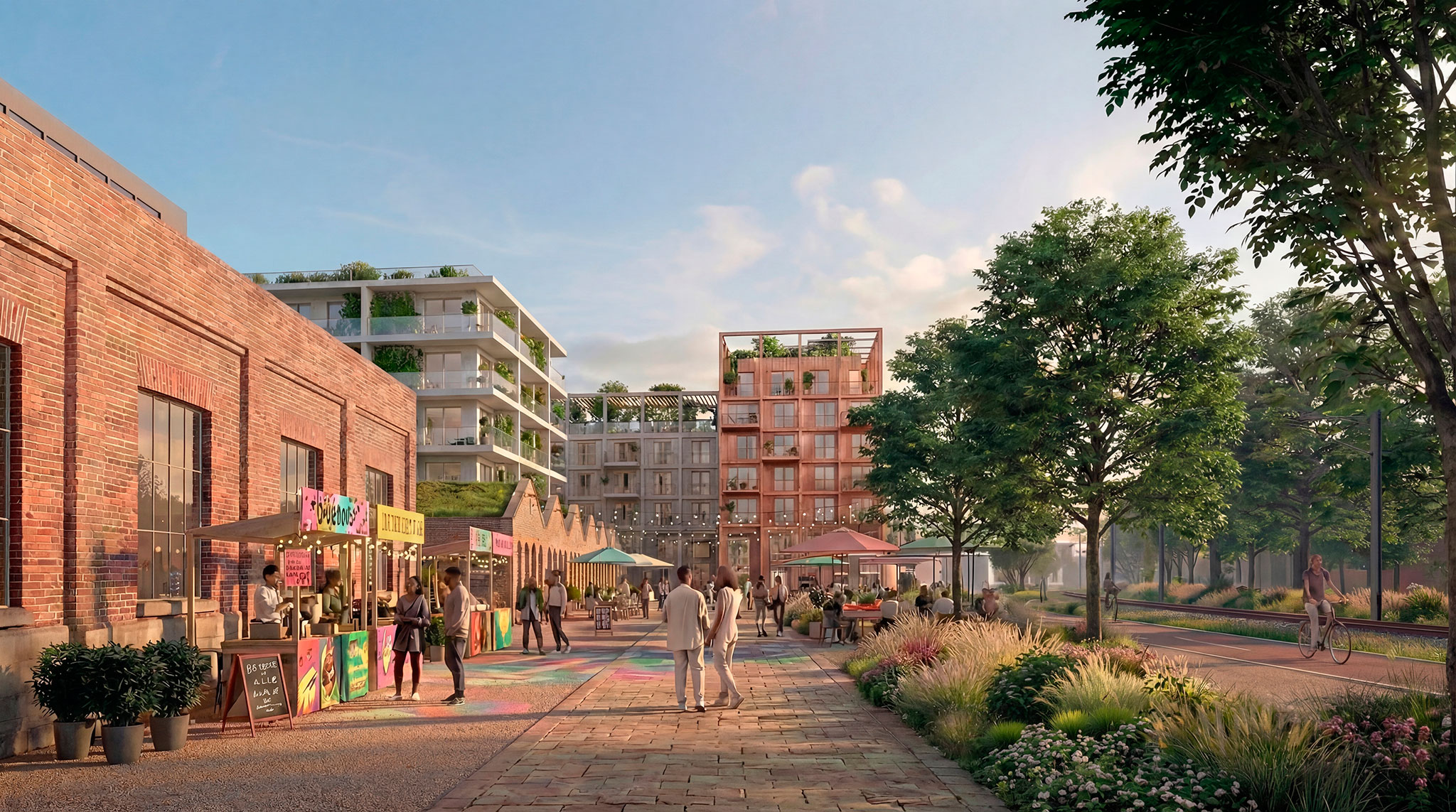 This dense urban core will gradually transform into a low- and mid-rise residential area, with a new network of green spaces on both sides of the railway line. Countering the dominant car-centric development pattern, a strong public transport presence will enable the creation of virtually car-free residential streets and plazas.