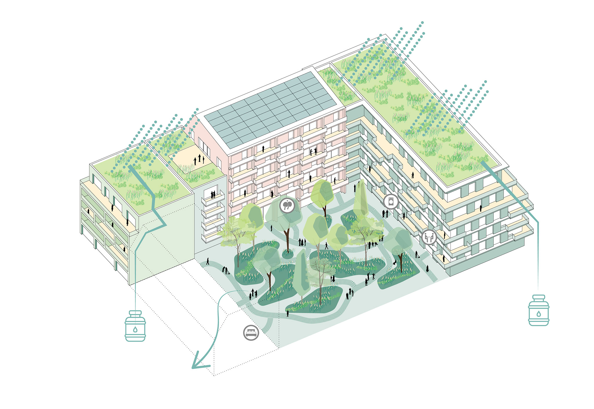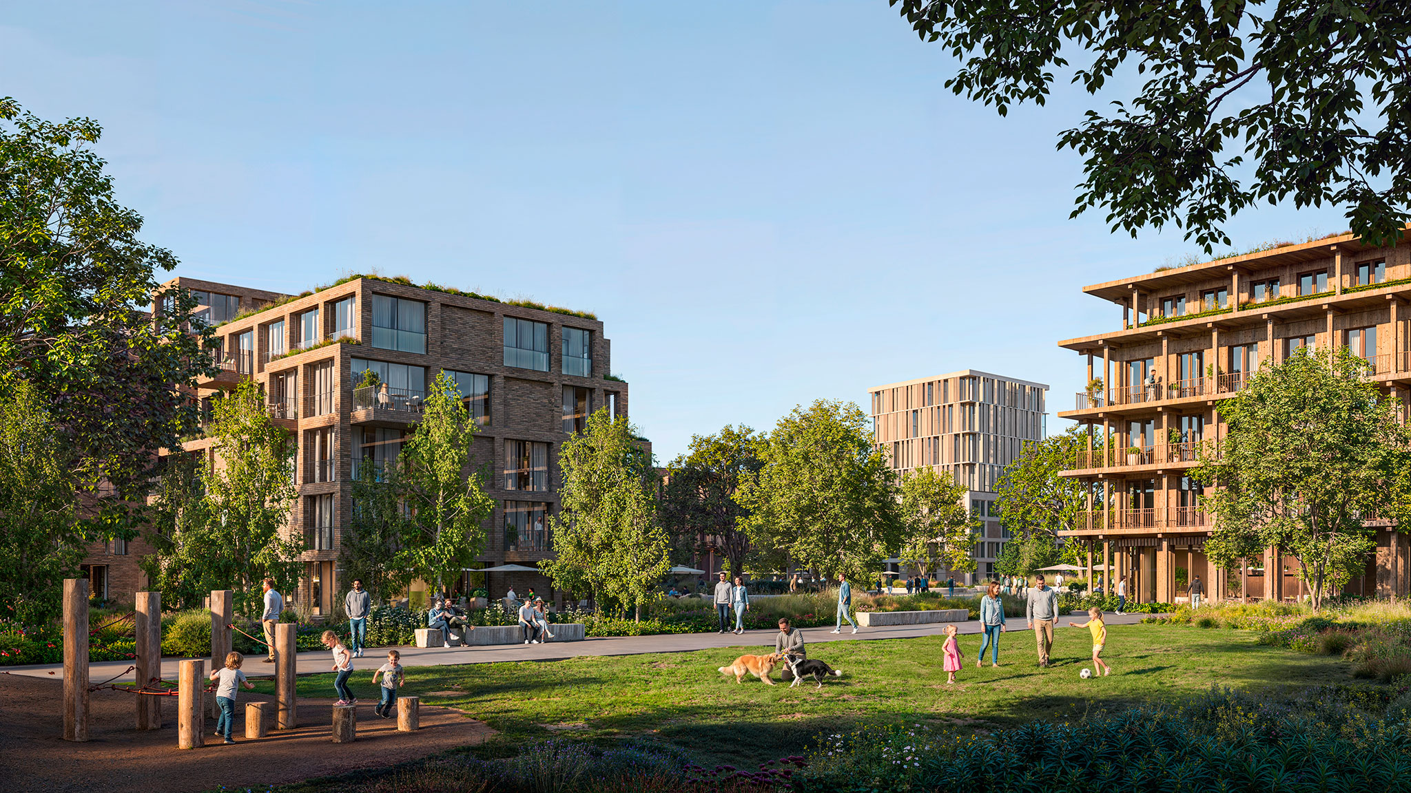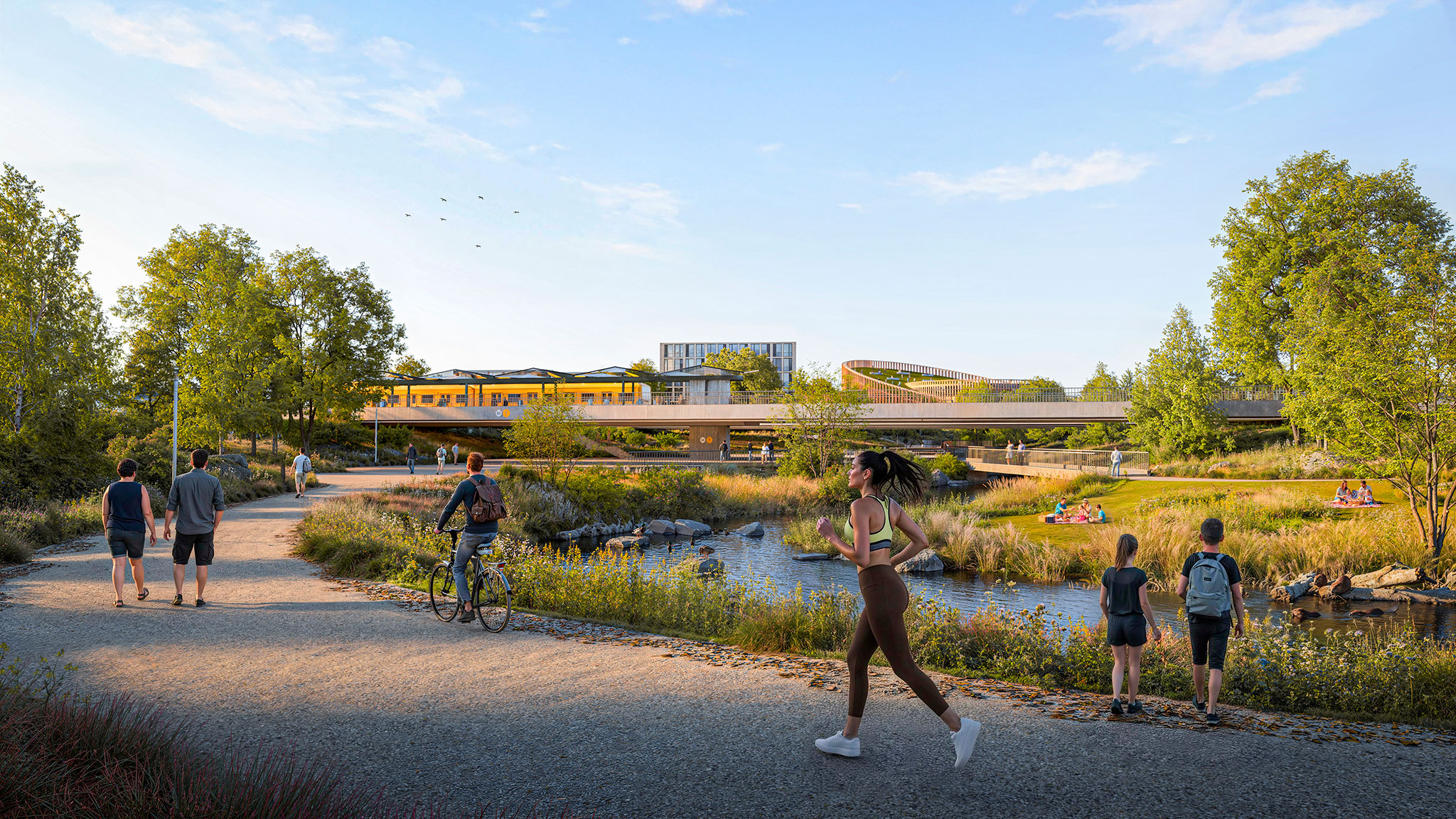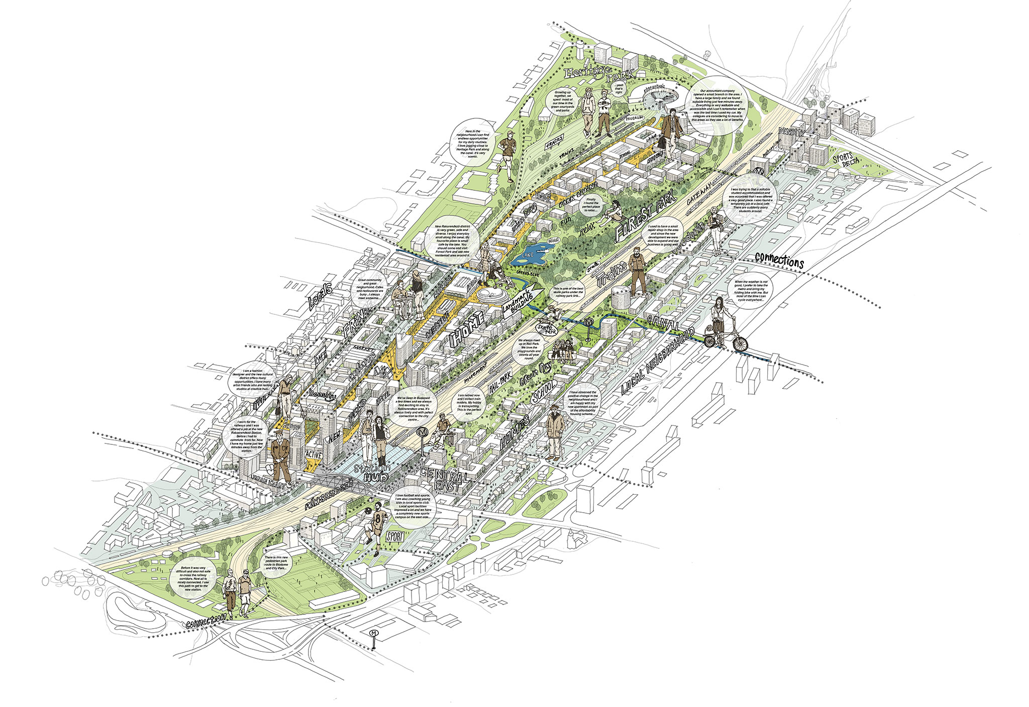 This dense urban core will gradually transform into a low- and mid-rise residential area, with a new network of green spaces on both sides of the railway line. Countering the dominant car-centric development pattern, a strong public transport presence will enable the creation of virtually car-free residential streets and plazas.