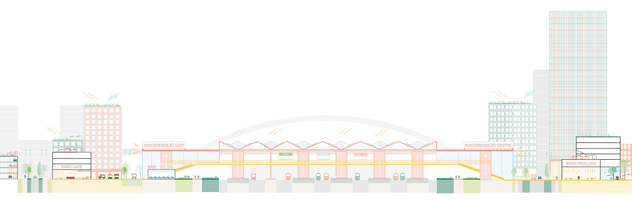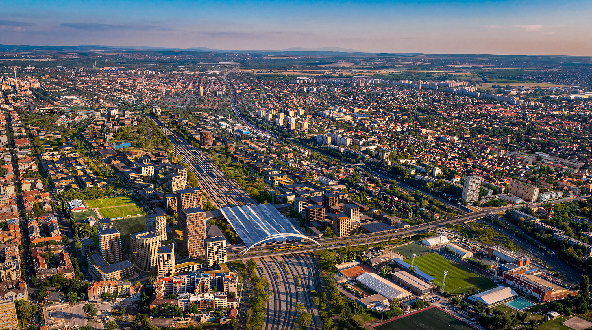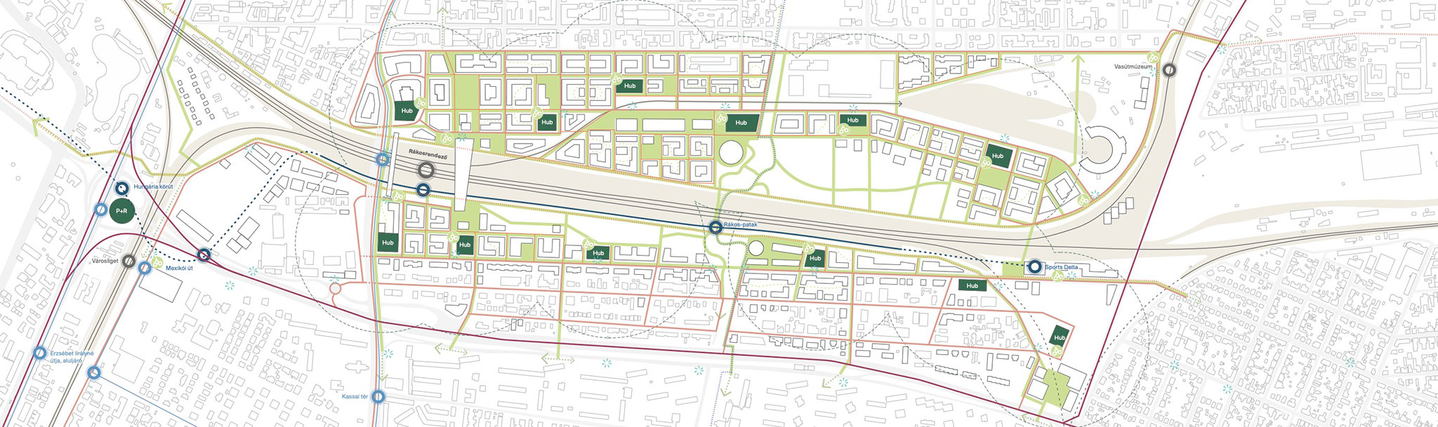 The proposal prioritizes landscape and ecological continuity, offering a clear, people-centered urban solution with six sub-districts, each with its own distinct character, linked by a local urban center, similar to the neighborhoods in Budapest's historic center. The Rákosrendező train station will be transformed into a multimodal hub serving as the central urban sub-district's axis.