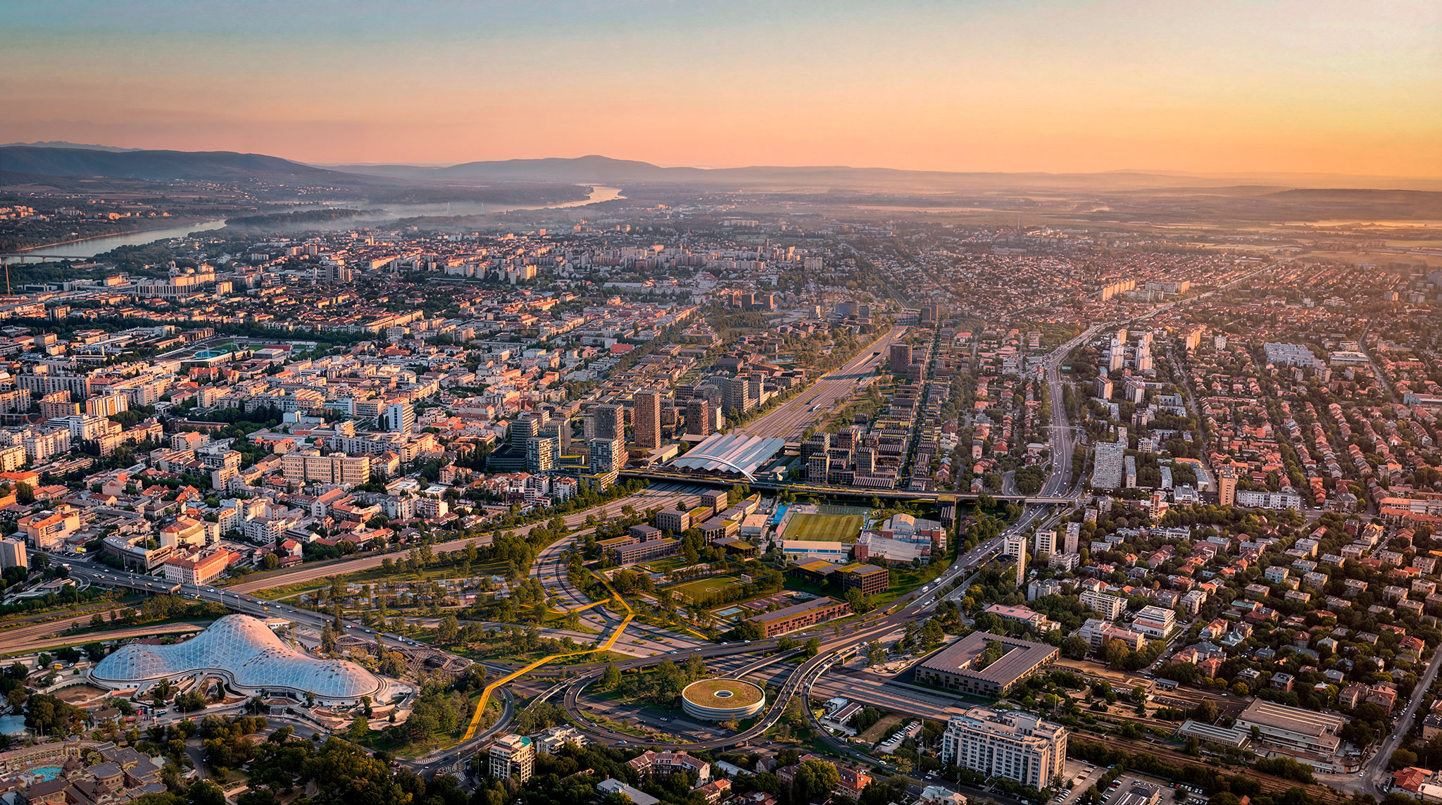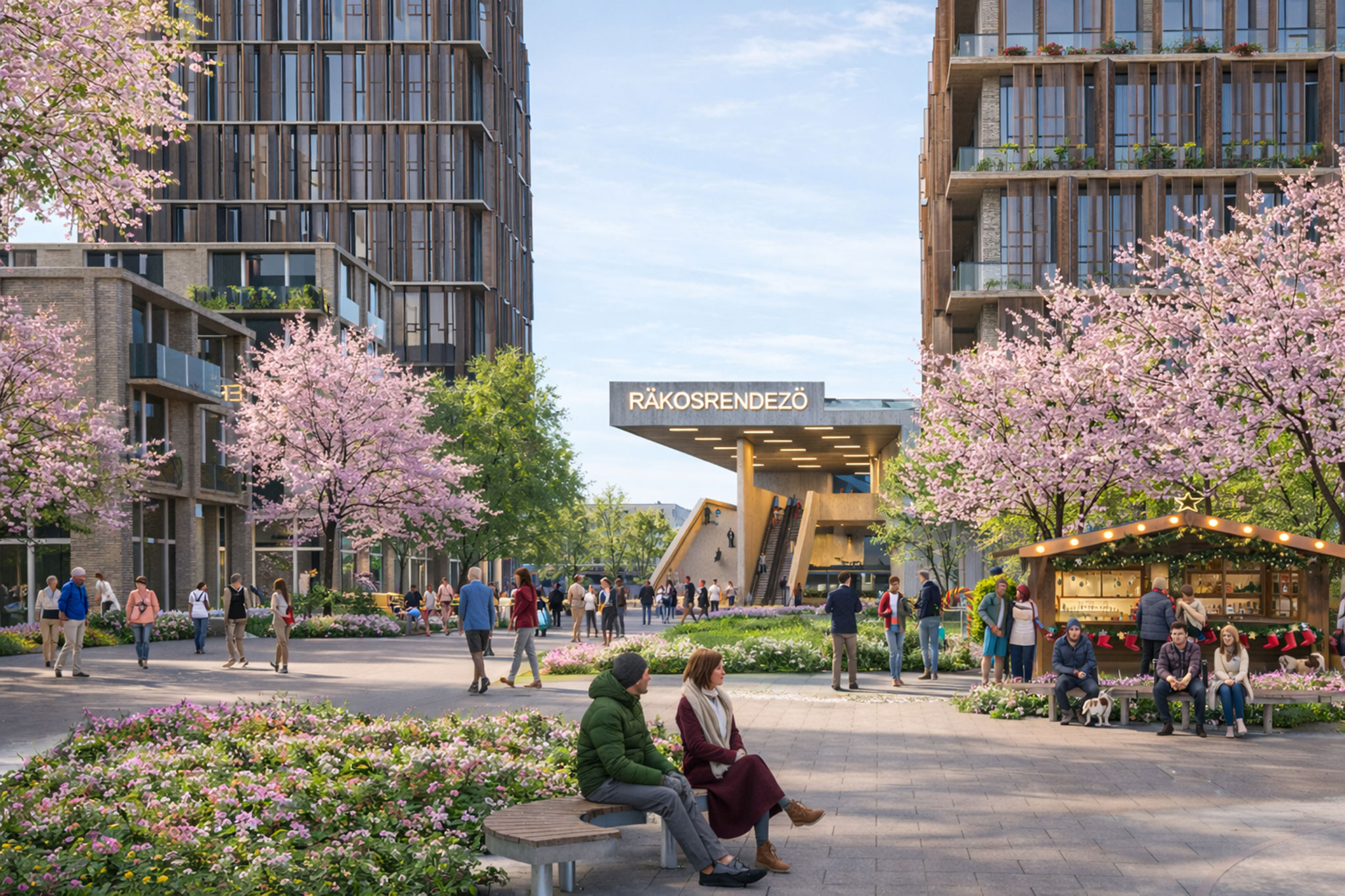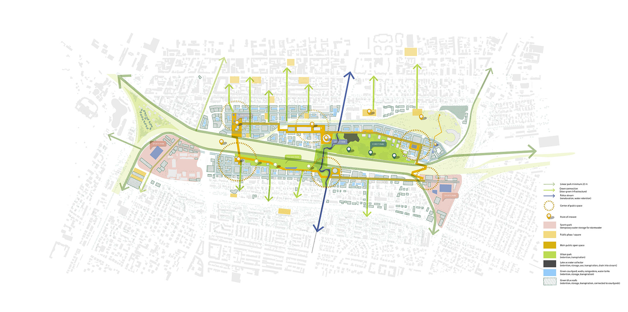 The proposal prioritizes landscape and ecological continuity, offering a clear, people-centered urban solution with six sub-districts, each with its own distinct character, linked by a local urban center, similar to the neighborhoods in Budapest's historic center. The Rákosrendező train station will be transformed into a multimodal hub serving as the central urban sub-district's axis.