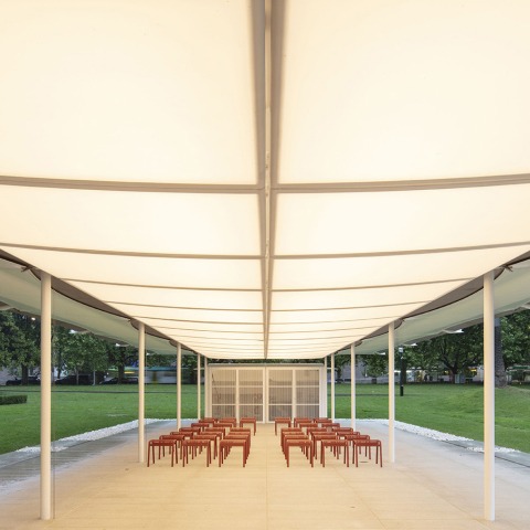 Perforated steel, stretched over the outer legs of the stool frame and rolled along the front to meet the mid rails, is an expanded version of the curved fabric cladding the roof structure.