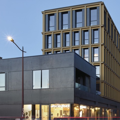 A soft insertion by taking the low volumetry of the townhouses and the Blockhaus on the boulevard.