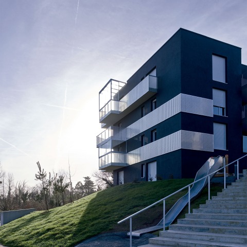 Aunque se ha utilizado el mismo enfoque de proyecto para ambos edificios, cada uno tiene una forma única de interactuar con el paisaje. El Edificio A está incrustado en la pendiente del sitio sin modificar el perfil del paisaje existente. En el lado de la calle, el edificio se encuentra ligeramente por debajo del nivel del suelo, mientras que en el lado del valle es visible el nivel subterráneo. Los pisos de la planta baja, por lo tanto, se benefician completamente de sobresalir del prado. El edificio B se encuentra a nivel del suelo y ofrece acceso directo al exterior desde los pisos de la planta baja.
