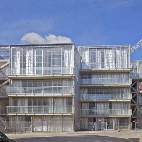 Some of the dwellings are duplex apartments. The flats , from T1 to T5, are running through. The living rooms, south-east oriented, open on to an unoverlooked terrace, that can be fully closed in winter. These wintergardens, widely opened in summer, encourage a bioclimatic system by avoiding overheating problems with a natural ventilation, and create a buffer space in winter.