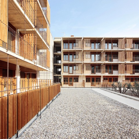 At the same time, the access and the community spaces are projected as a relationship place, intermediate spaces between the dwellings and the outside space. On this way is understood the footbridge, as a tradition element, where the corrugated steel mesh responds with more or less density to the necessities of the program (handrails, lattices, balconies…), allowing the façade to home vegetal colonizations which, add up to the black poplars, refresh a spaces whose orientation will make it really appreciated on the warm season.