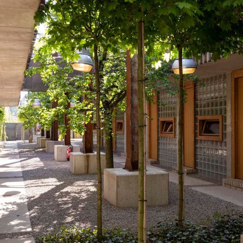 The complex has a modular design, the rooms have a living-dining room, a bathroom, a bedroom and a small interior terrace. The materials used are mainly concrete, brick, wood and glass, the latter two, together with the vegetation in the central area, will try to create a warm and welcoming atmosphere.