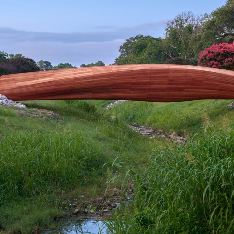 Volkan Alkanoglu architect, designed a sculptural wooden pedestrian bridge called Drift, to cross a small stream in Fort Worth, in North Texas, United States.
