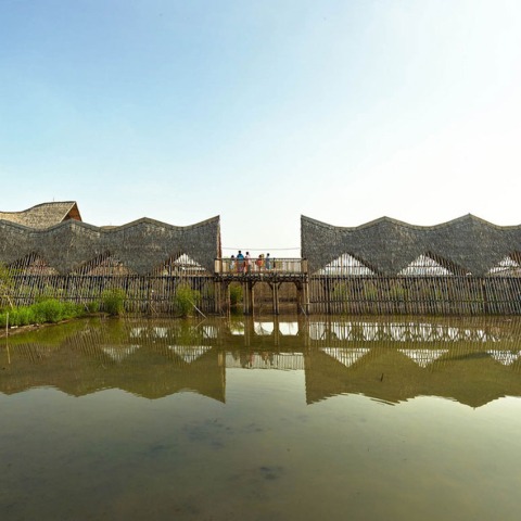 (The building integrates 4 modular buildings, with efficient access point in one central court yard, due to limitation of local land zoning of what can be built and what can not be built.) The solution to answer the brief of the project is to create an optimum collaboration, or bridge relationship in economic and creative process of construction in two important levels of masonry steel and bamboo construction which can enrich the economic impact of surrounding.