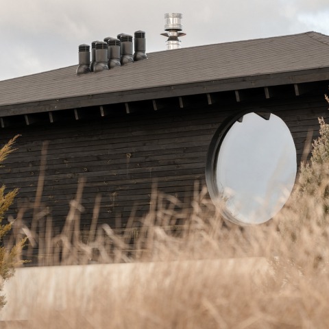 Constructively, internally and externally, the ground floor is finished with rough “mazanka” plaster, reminiscent of traditional Ukrainian rural homes. The interior finishes of the upper floor are covered with birch plywood, and the exterior, is in burned wood following the kisugi system.