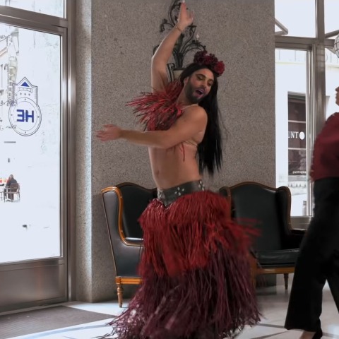 The video of Mi tío Juan, produced by Alba Reig, is set in the Hotel Europa Madrid and creates a fun environment where everyone feels free to express themselves. The characters take over the hotel's spaces, such as the balconies that overlook the Puerta del Sol, and celebrate their individualities.