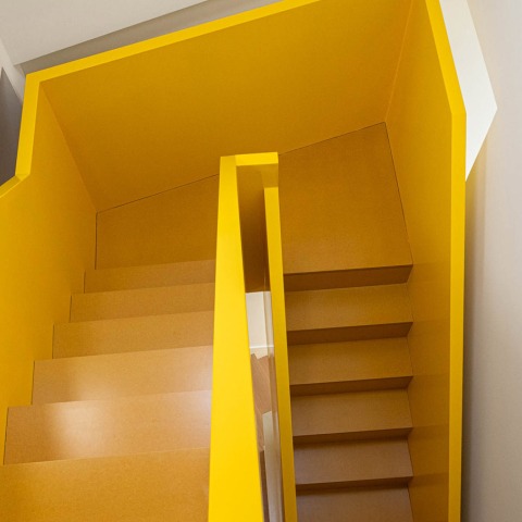 In contrast to the building's striking exterior, which boasts an intense chromatic palette, the interior design adopts a more nuanced approach. Spaces of transition, whether programmatic or on different levels, are highlighted with tasteful chromatic accents in a calming sea of white, allowing for a hierarchy of design element.