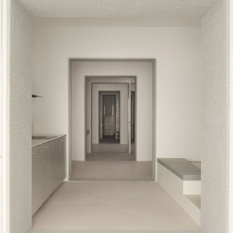 The design of the project is based on a clear tactic. The longitudinality of the space is emphasized through the concatenation of rooms. This makes the conceptual duality of the project become evident. A succession of transverse walls serves two functions: on the one hand, they appear to fragment the space. On the other, they are perforated so that the spaces are connected and each one is a continuation of the previous one. The rooms, together with their perforations, gradually change proportion and size. This operation makes the progression through this sequence simulate symmetrical repetitions and generates the illusion of an infinite perspective.