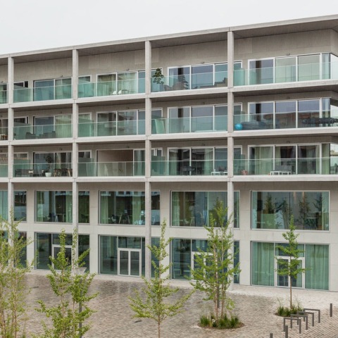 The open and intimate character of the living space created by the balconies, is further enhanced by the use of the materials. These are very physical: the discreet grey prefabricated concrete elements of the balcony construction are combined with Spanish limestone that was chosen to subtly match the grey of the concrete. The window frames are made of anodised and polished aluminium. The terraces are covered with wooden slats.