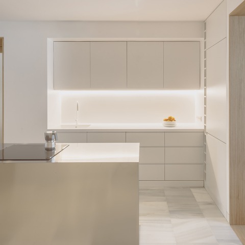 The different rooms in the apartment are connected through a series of deep thresholds. These thresholds frame the interior views of the residence and connect all the spaces, while establishing a clear physical limit between the otherwise continuous units. They are marked by a strong material, textural and chromatic contrast. On the one hand, the main finishes of the apartment revolve around a white color palette. They include white plastic paint for the walls and ceilings, white macael marble for the floors and white lacquer for the built-in cabinetry. On the other hand, the thresholds are highlighted by the use of naturally finished oakwood paneling on the floors, jambs and lintels. The sliding door guides and edges are also lined in oak wood so that they are completely concealed when fully open. Two of these thresholds, linked to the three bedrooms, are deeper than the rest, conforming the walk-in closet areas and the accesses to the bathrooms, hidden behind seamless doors.