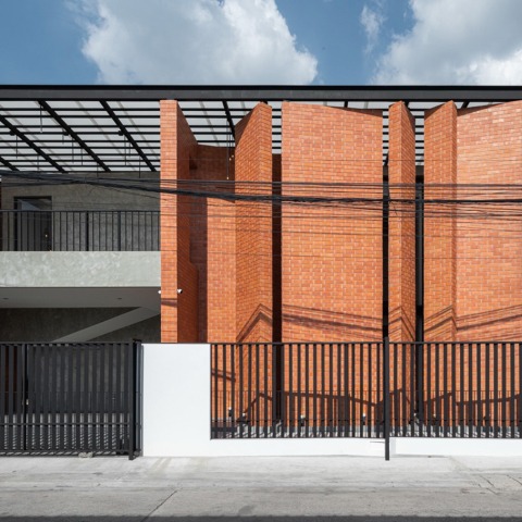 A gigantic wall of 7.5 meter height at the front facing west is divided into several strips, various in sizes and thickness levels, parting and overlapping freely from different angles and directions. Covered by brownish-orange terracotta tiles, the wall stands high to support a translucent roofing panel where many small lights strung in rows like waves. These decorative elements on the front of the two-story house in Pak Kret, Nonthaburi not only shade the house from direct sunlight but also intentionally create an interplay between natural sunlight and the light after dark: a lively area of a conversation with light.