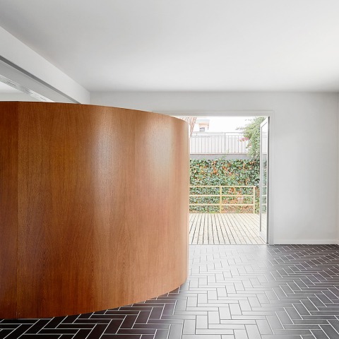 The intervention on the ground floor (daytime living areas) and the first floor (nighttime living areas) can be read as a dialectical play: on the ground floor, the spaces are physically connected but visually and functionally separated, while on the first floor, the main room is visually connected but physically separated. The oak veneer boards reinforce this play, lining the separating element on the ground floor (the curved partition), and the unifying element on the first floor (the hallway and central room continuum).