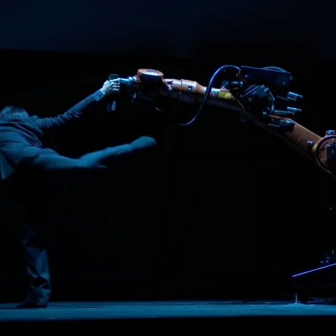 HUANG YI & KUKA is a poetic work that intertwines modern dance and visual arts with the realm of robotics, revealing humanity through a series of vignettes between live dancers and KUKA, a robot conceptualized and programmed by Huang. "Dancing face to face with a robot is like looking at my own face in a mirror ... I think I have found the key to spin human emotions into robots," Huang asserts.