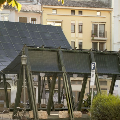 The pavilion is formed by two triangular wooden porticos that support a large Alicante blind, also made of wood, forming a catenary. The entire project is painted dark green, responding to one of the five traditional colors in which blinds in this region are usually manufactured.