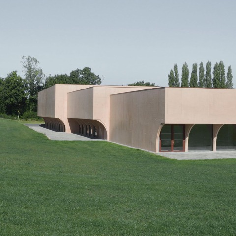 To affirm the presence of the project in the landscape, the materiality of the building is homogeneous and continuous on all facades. The project with shades of pink concrete, obtained by pigmentation of iron oxide hematite, asserts itself and reveals its presence in the landscape. The new multi-purpose room is as follows: a carved volume, set in its vegetal environment. The massiveness of the created volume is then shaped, hollowed out in its bowels. Carved half arch arches accentuate and punctuate the glazed curtain walls. The horizontal bands of the halls and the entrance are then outlined, offering wide openings on the landscape, protected from direct sunlight by the high masses of the construction.